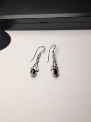 These vintage Sterling Silver Celtic drop earrings feature oval black onyx gemstones, adding a touch of elegance to any outfit.