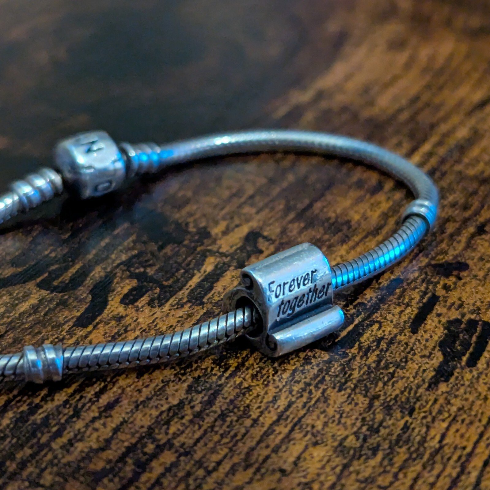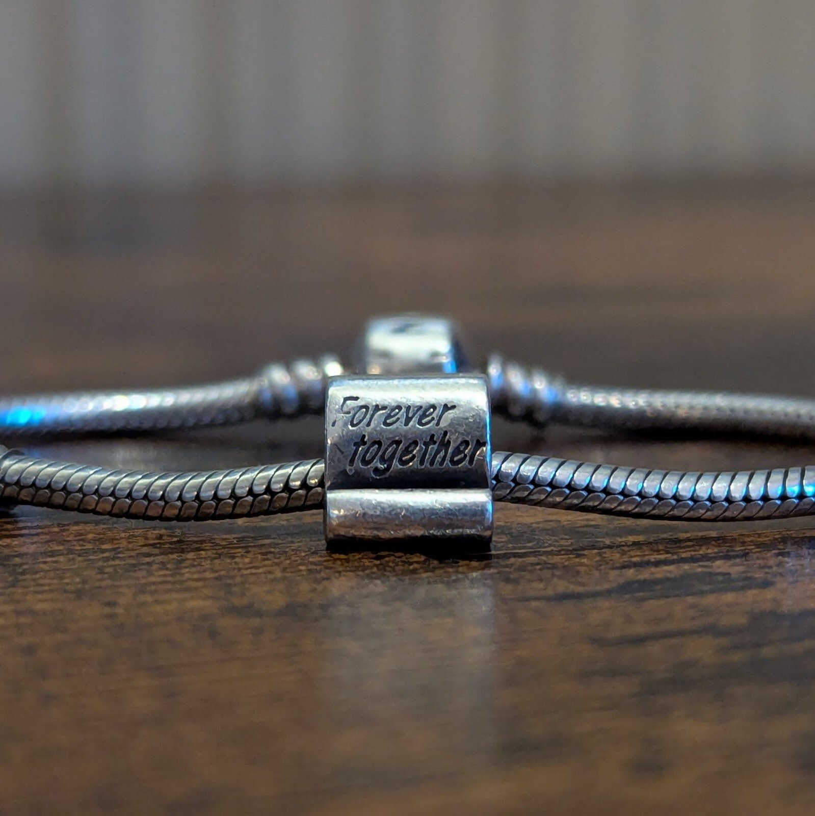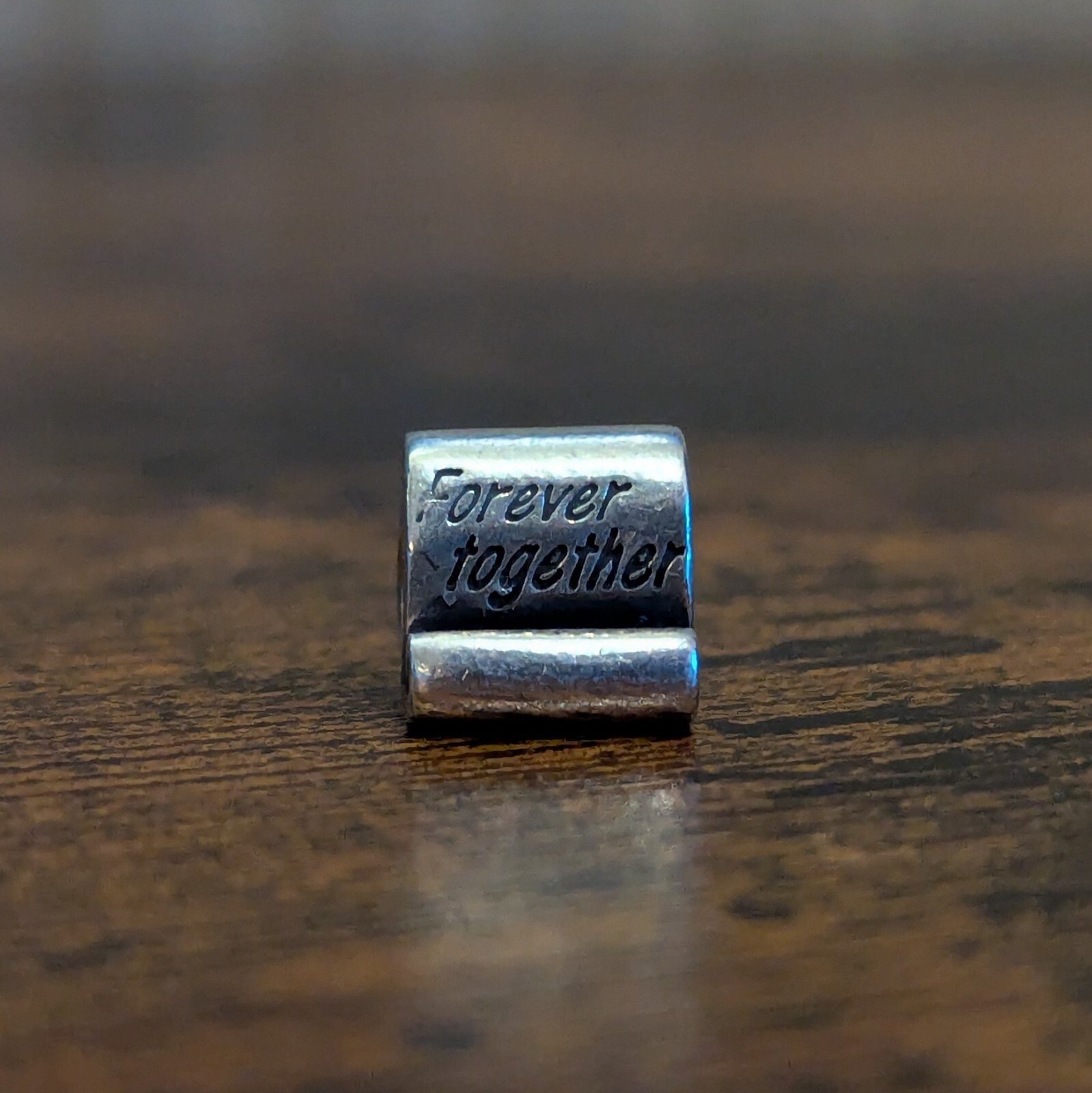 The Pandora Forever Together Charm is a sterling silver charm adorned with the words “Forever Together.”