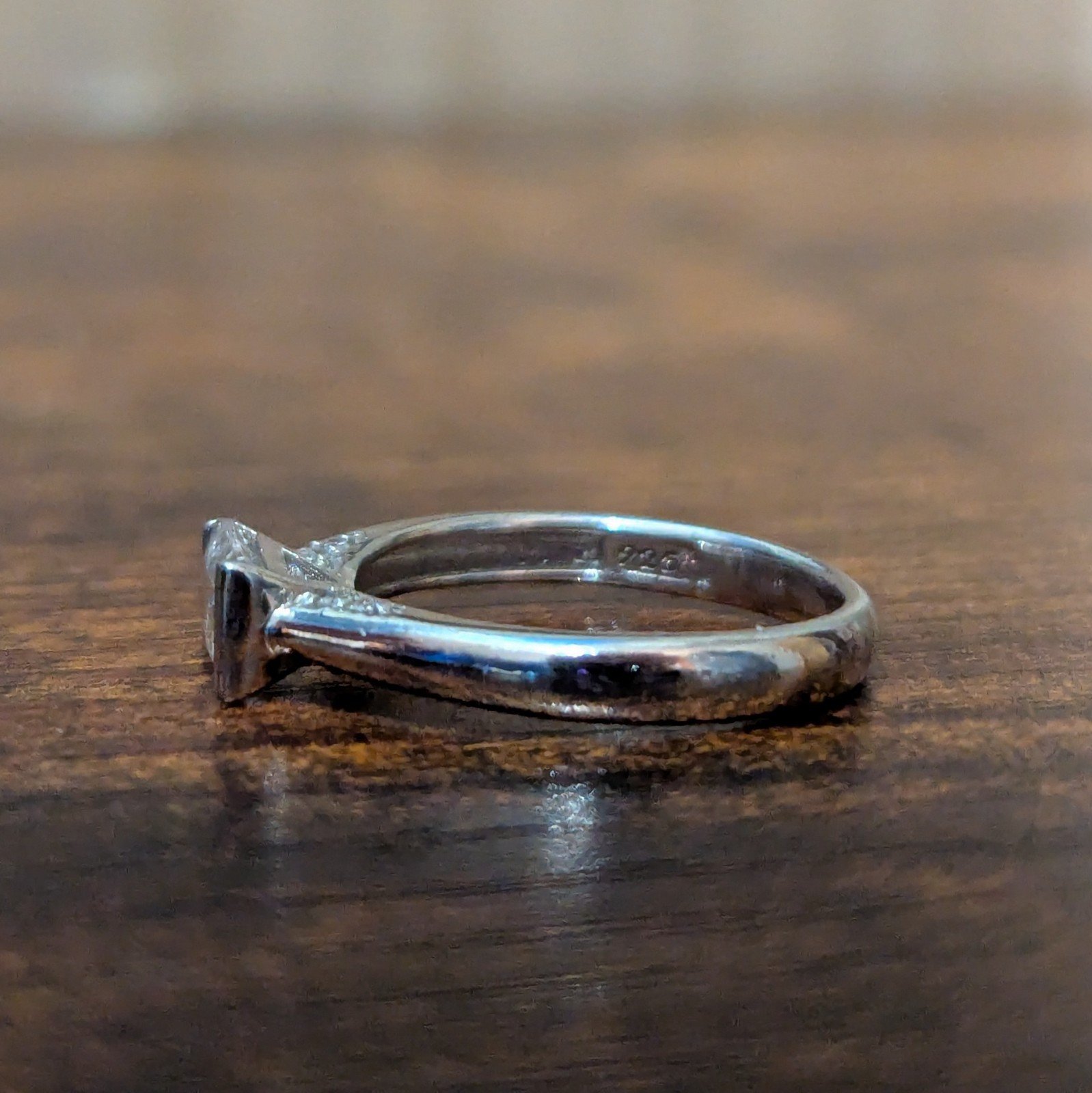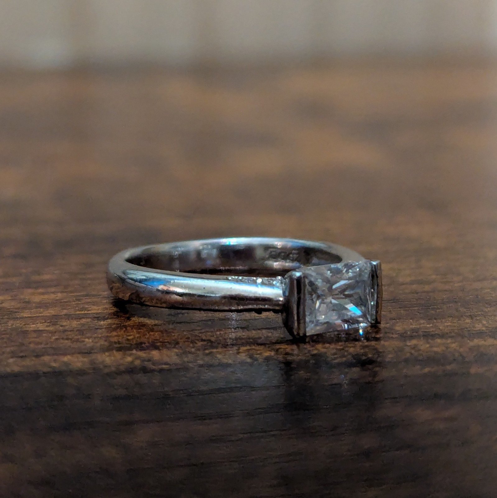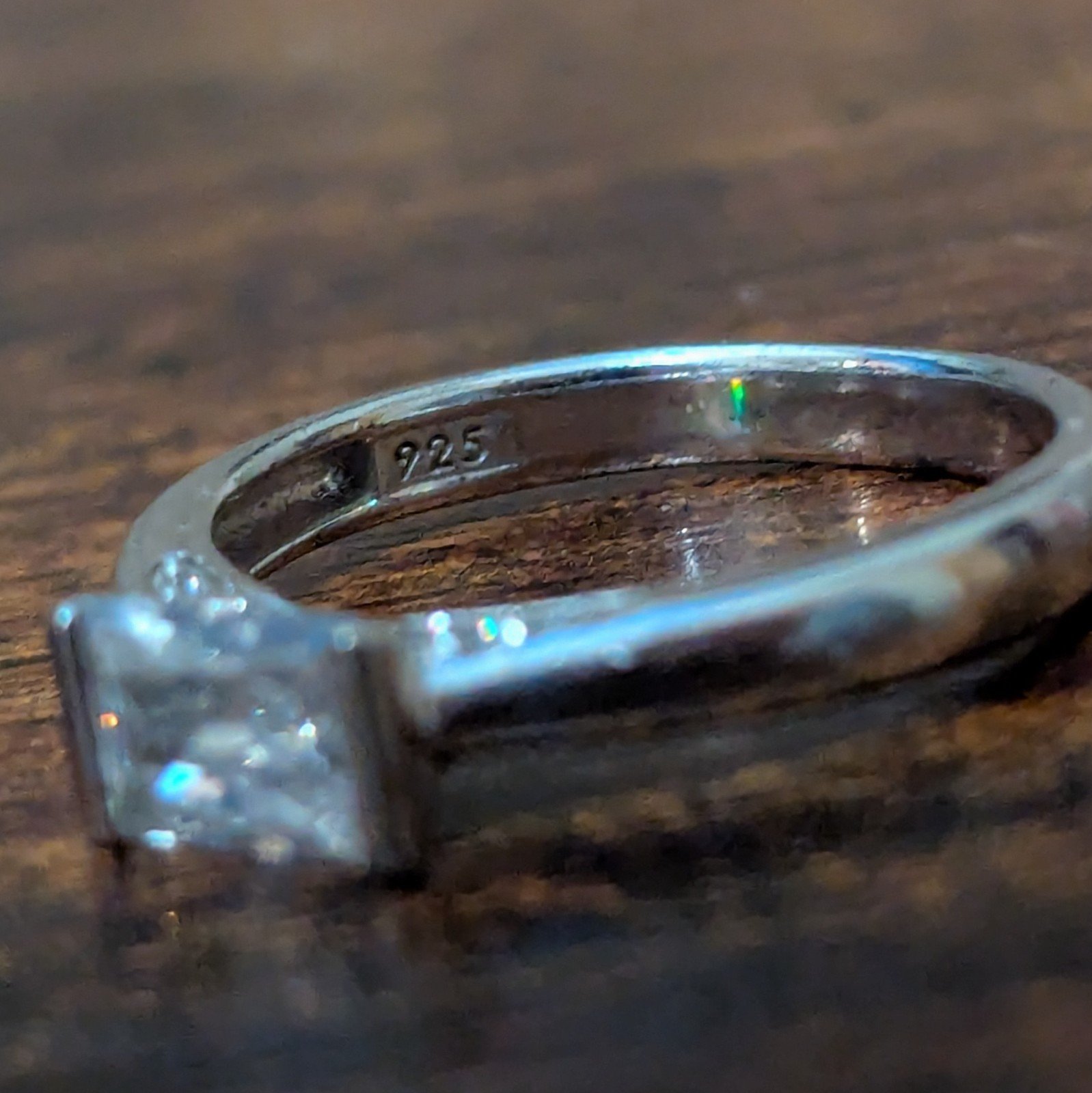 This is a sterling silver ring in size O 1/2, featuring a cubic zirconia (CZ) stone in white/colourless. The ring is hallmarked as 925 sterling silver and has a silver colour.