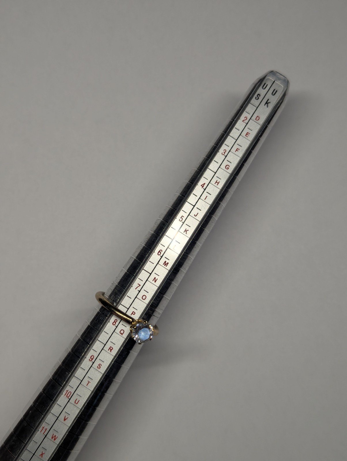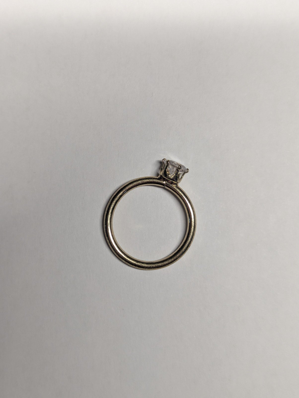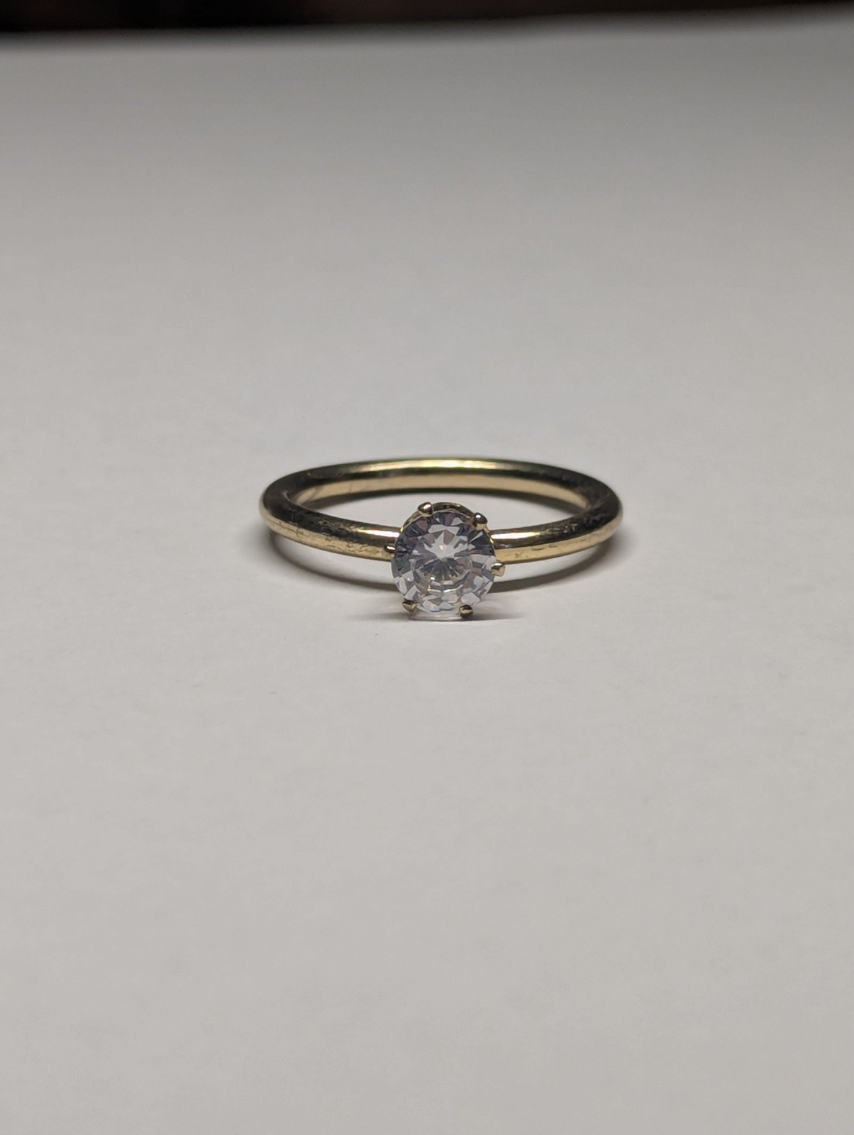This Vintage Costume Jewellery Solitaire CZ Gold Tone Ring in size P features a round white/colourless CZ stone set in a solitaire style.