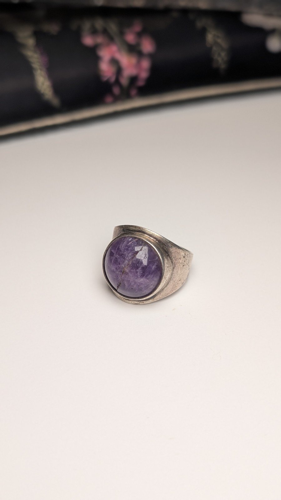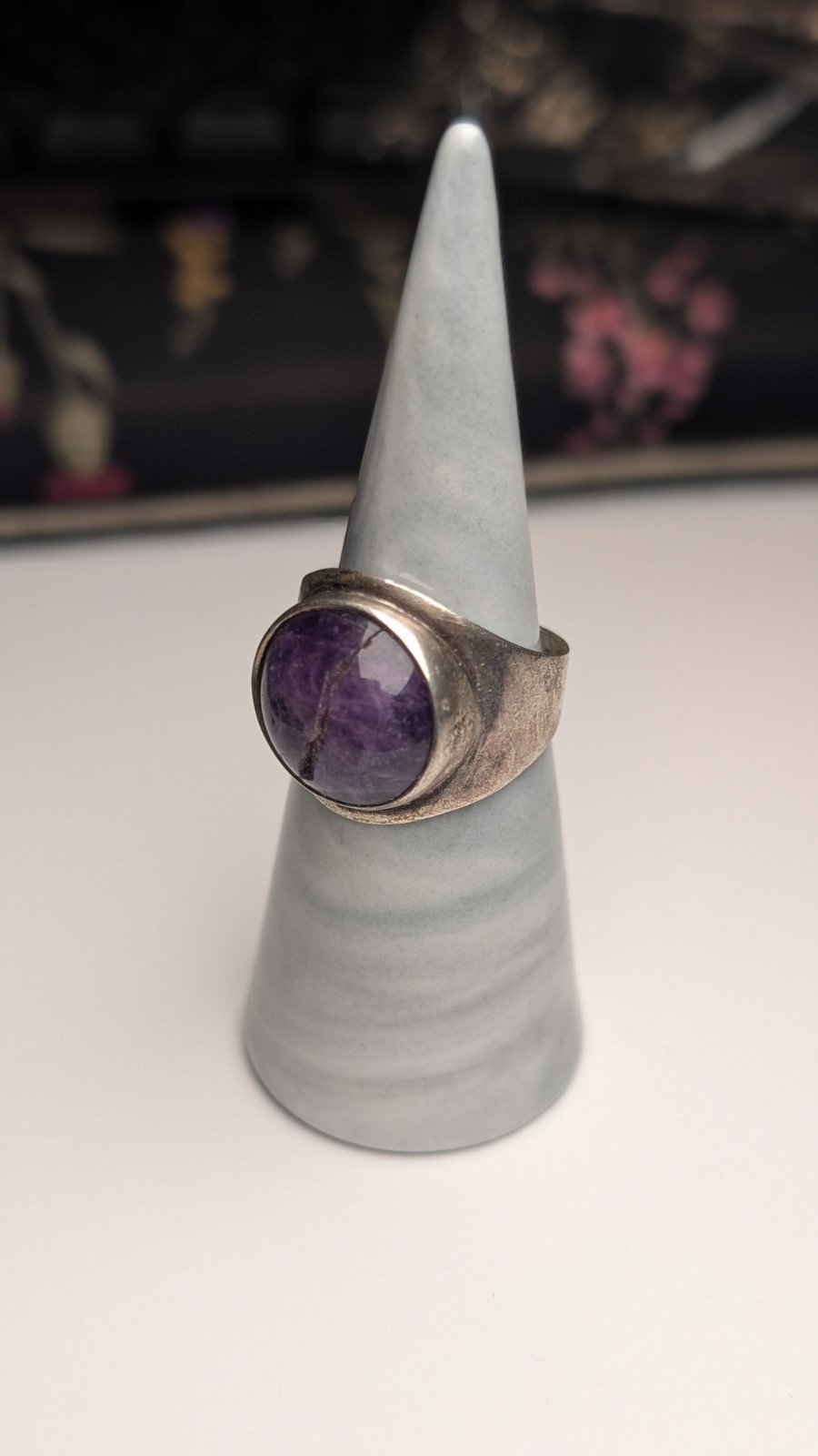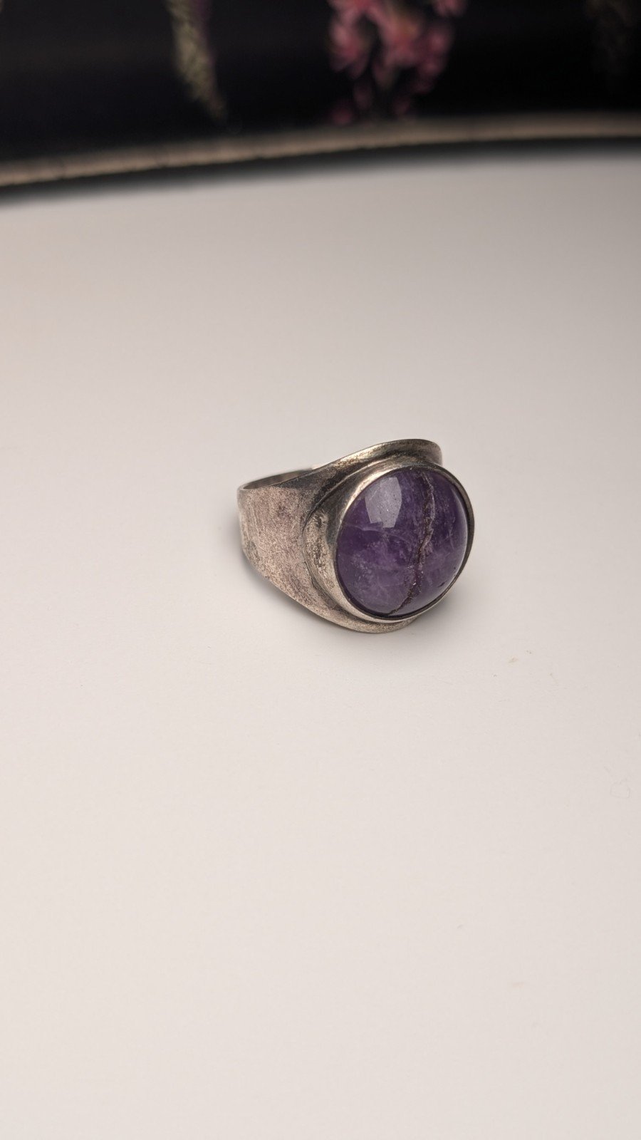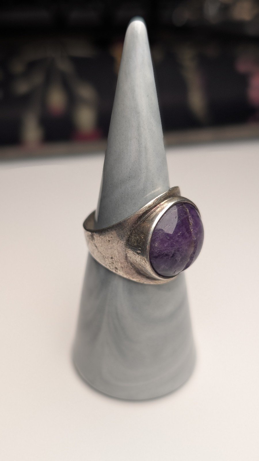 As seen in the images this ring has a purple amethyst stone that is cracked right down the middle. It is still locked into it’s setting although it does slightly move (but does not fall out). Can be fixed with resin / glue / potentially filled with gold/silver for a unique look)