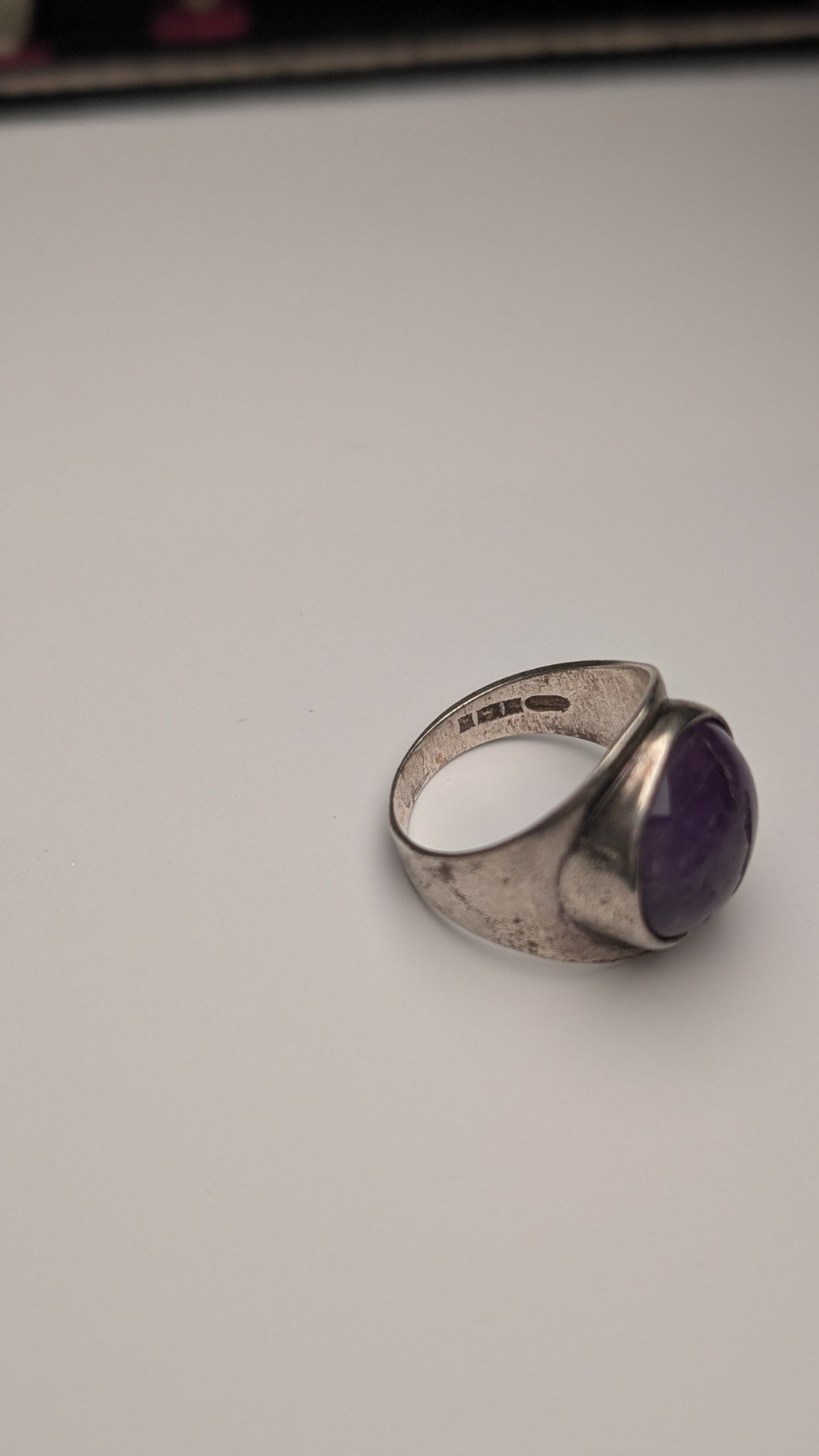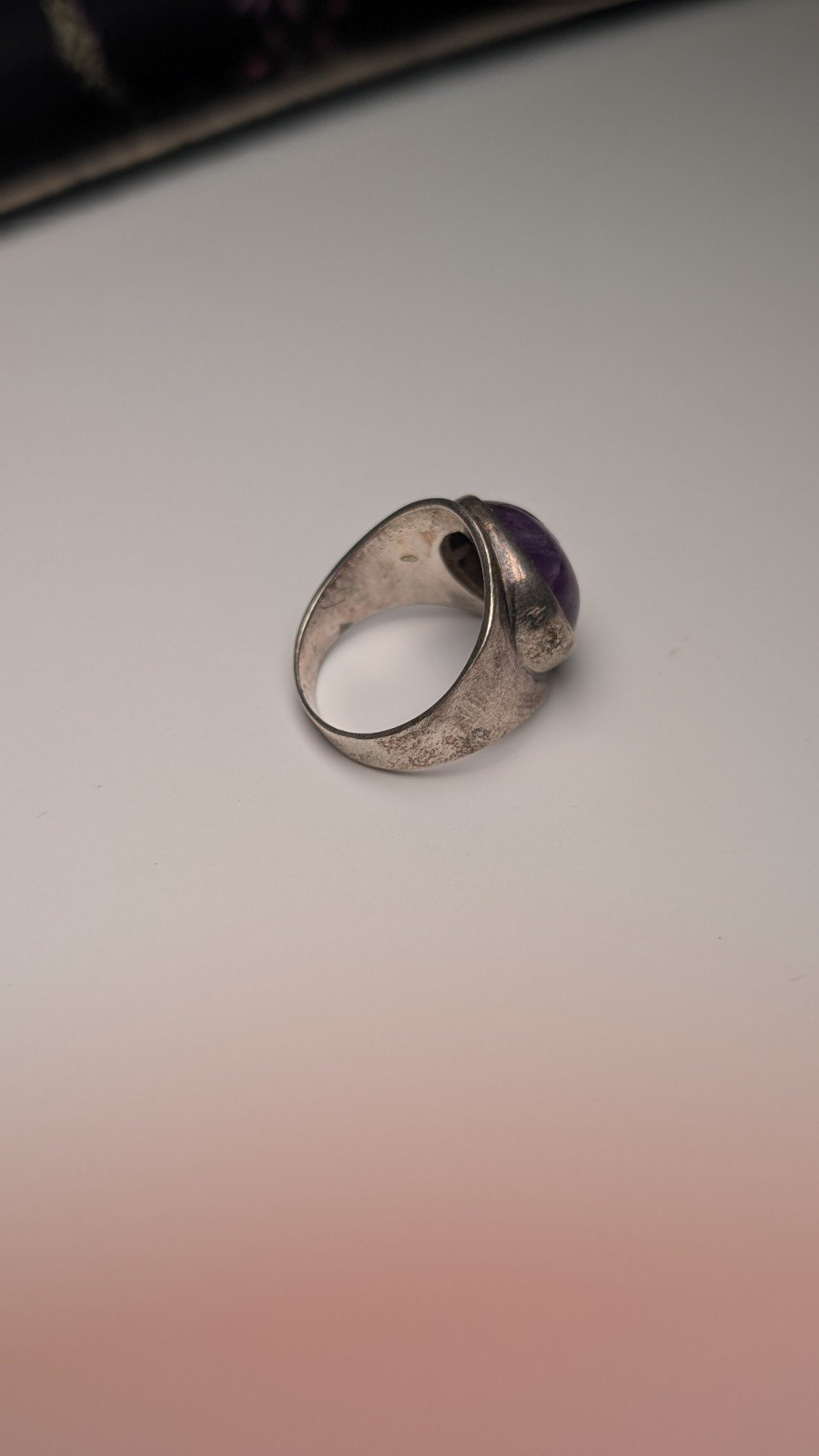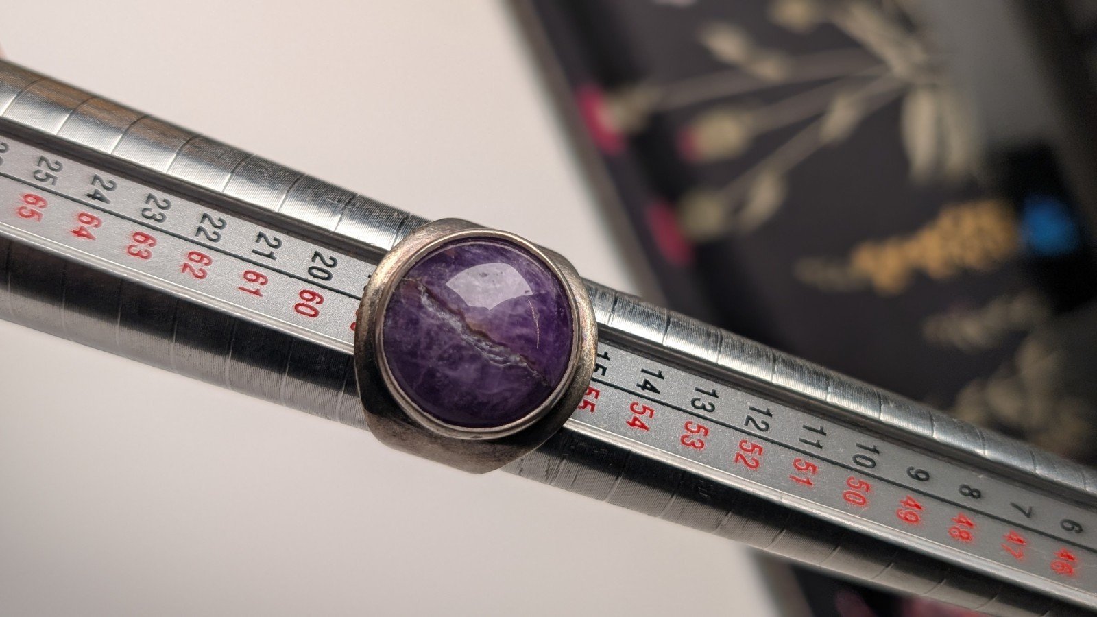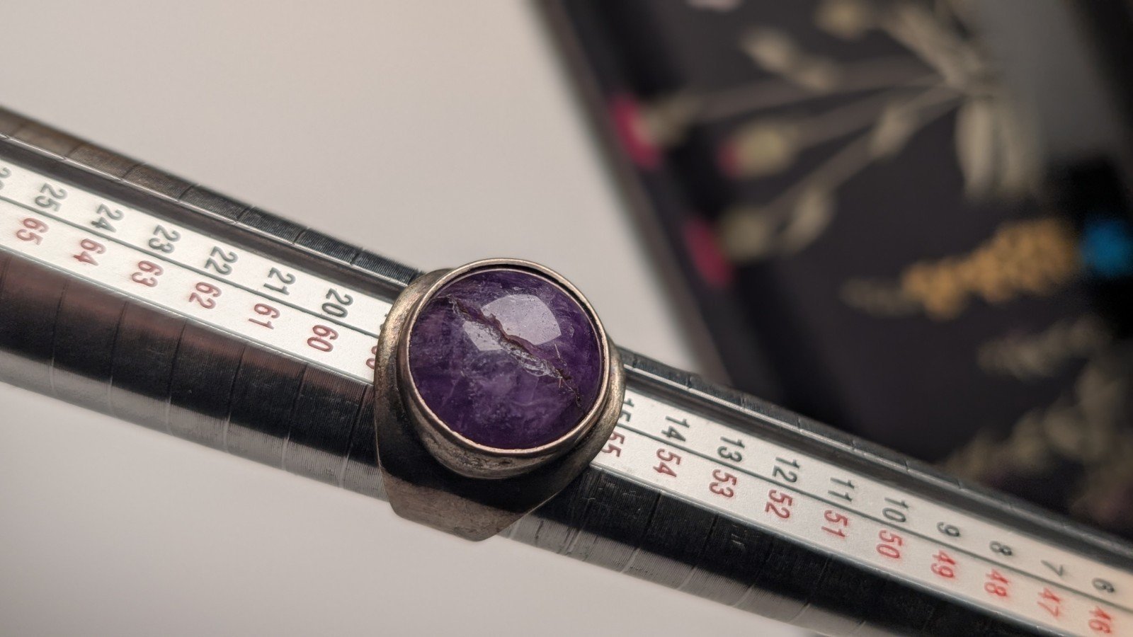 As seen in the images this ring has a purple amethyst stone that is cracked right down the middle. It is still locked into it’s setting although it does slightly move (but does not fall out). Can be fixed with resin / glue / potentially filled with gold/silver for a unique look)