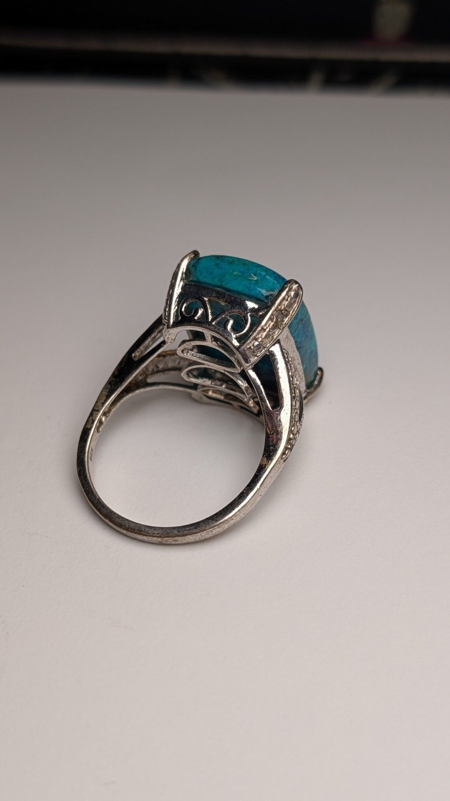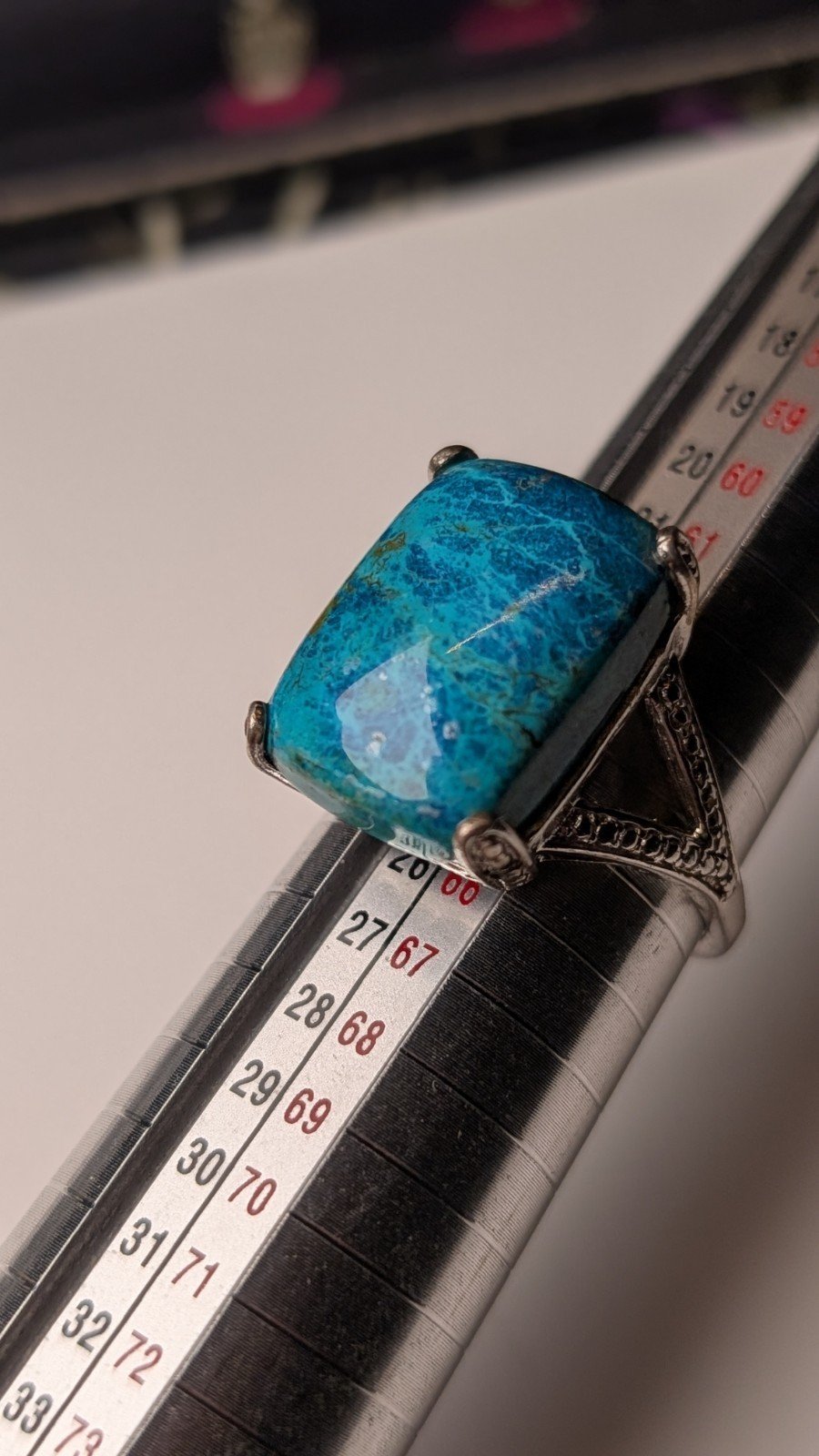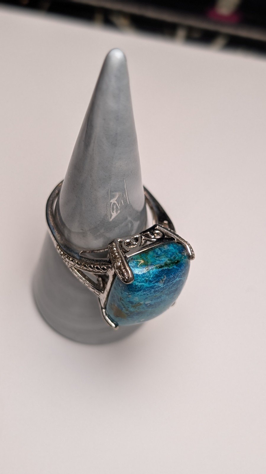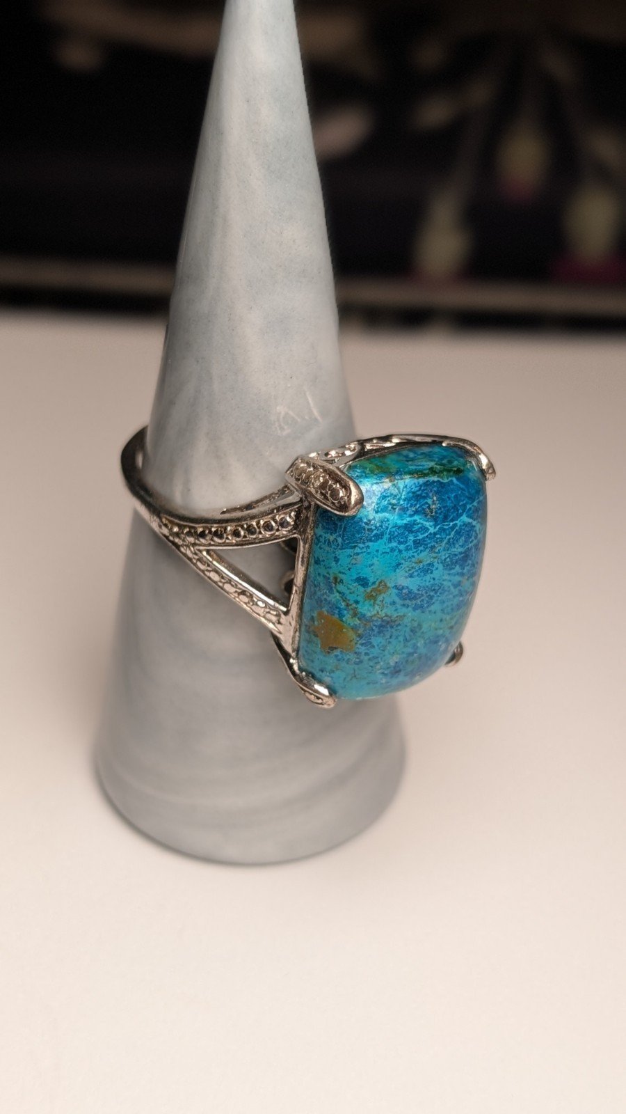 This vintage sterling silver ring features a beautiful blue Shattuckite gemstone as its main focal point.