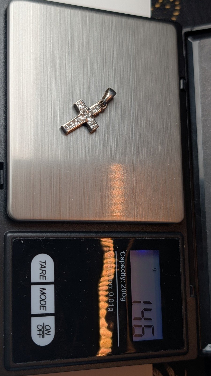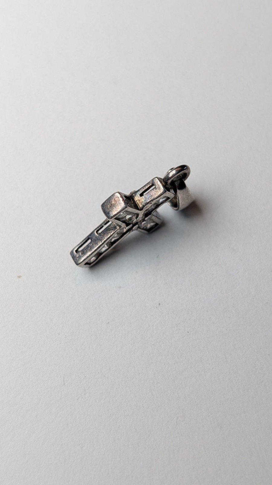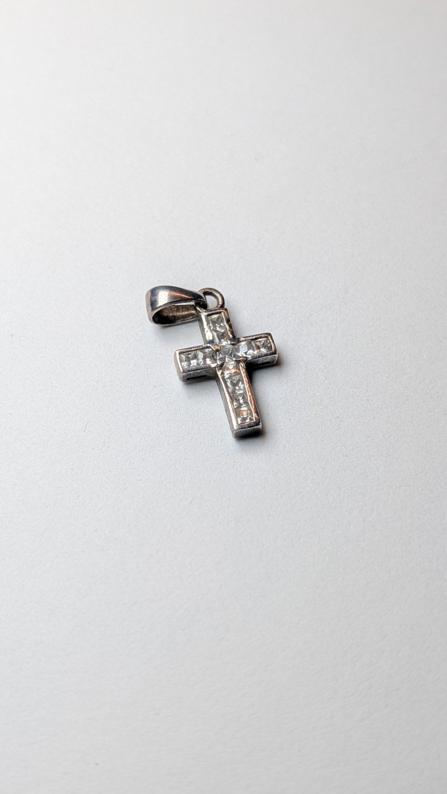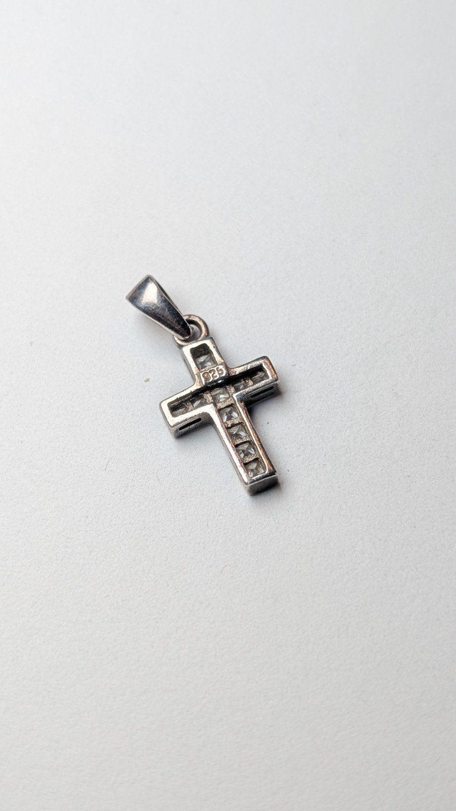 This vintage pendant features a Christian cross design made from 925 sterling silver. The cross shape is adorned with CZ stones, giving it a subtle yet elegant look.