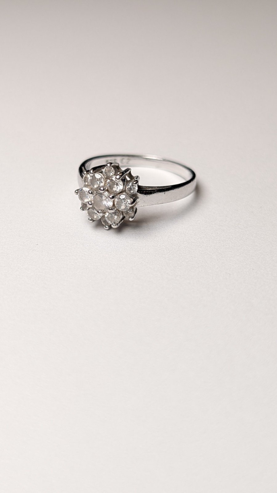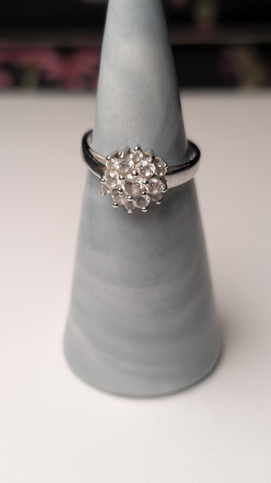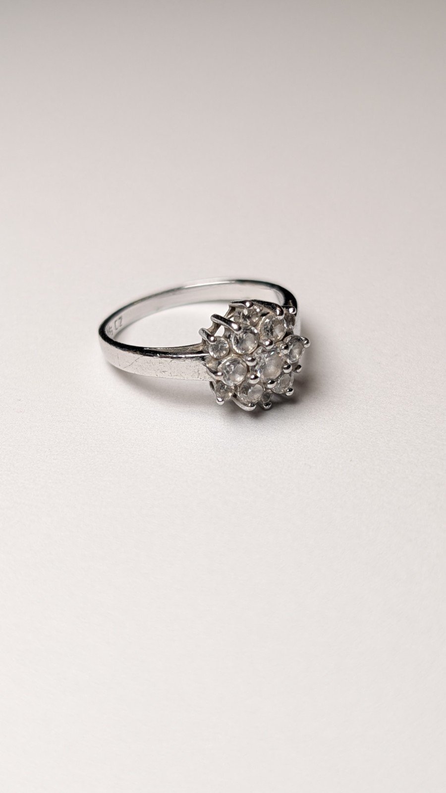 This vintage sterling silver clear cluster ring, with a ring size of M 1/2, is a beautiful piece of gemstone jewellery.