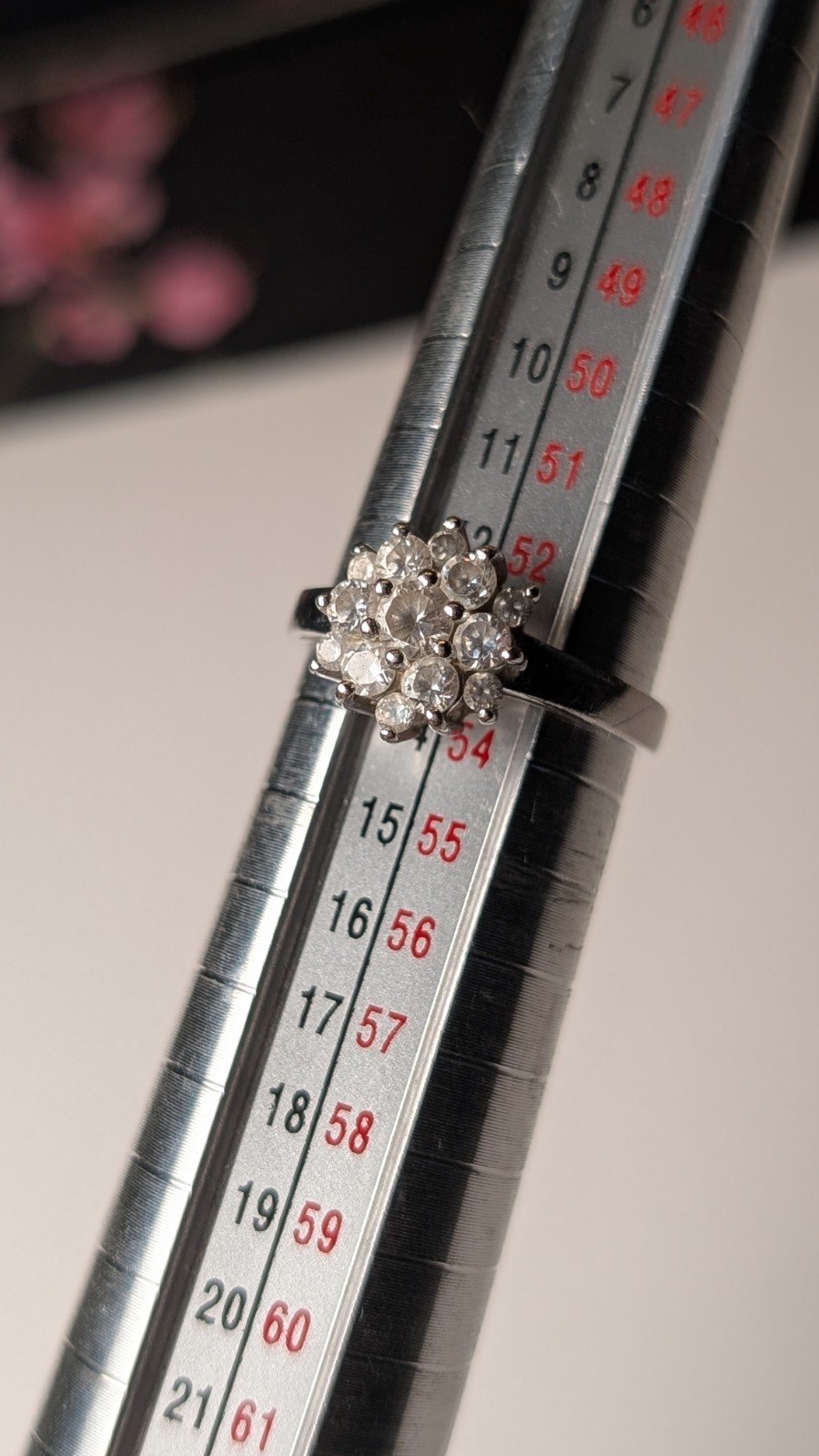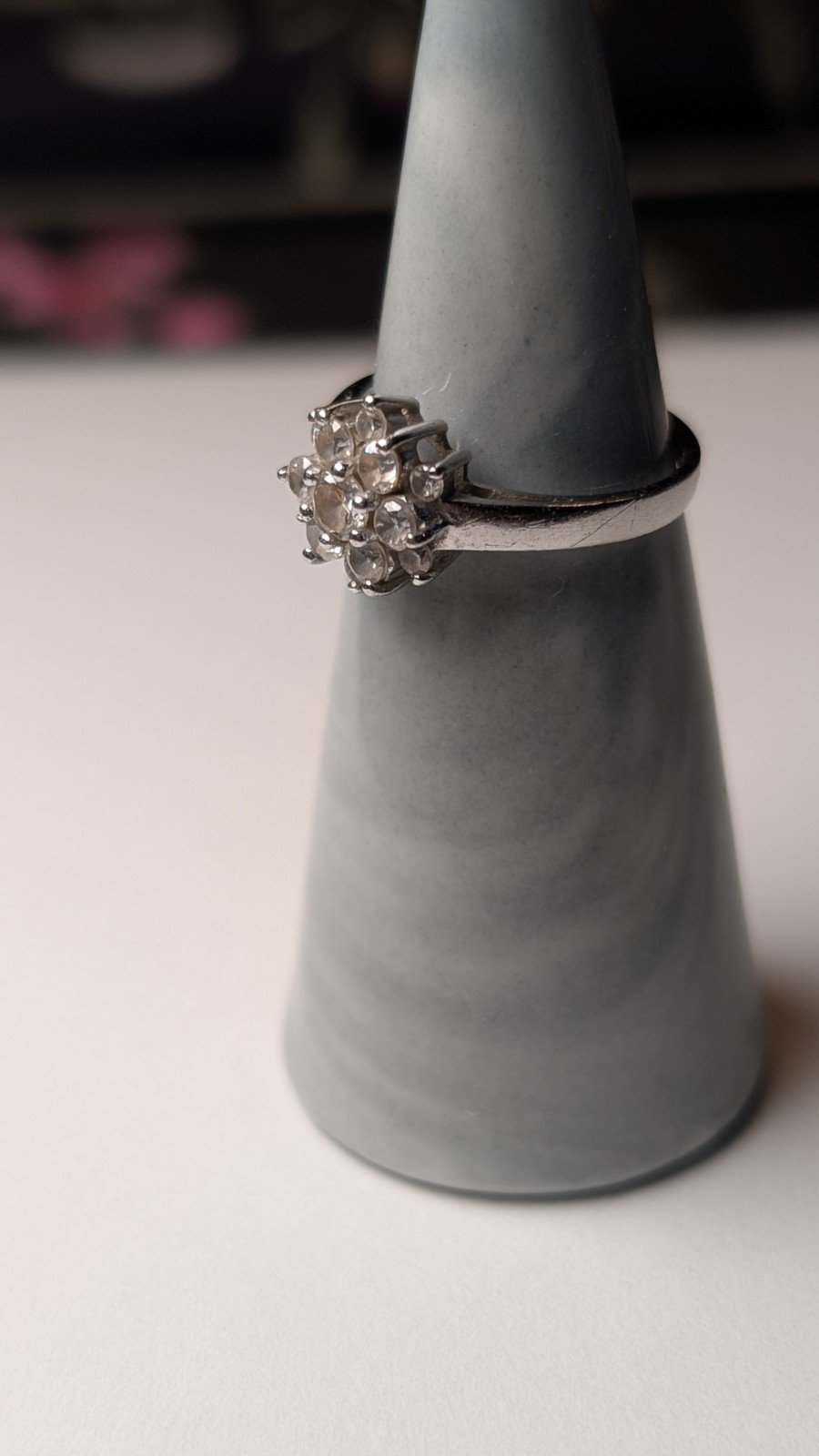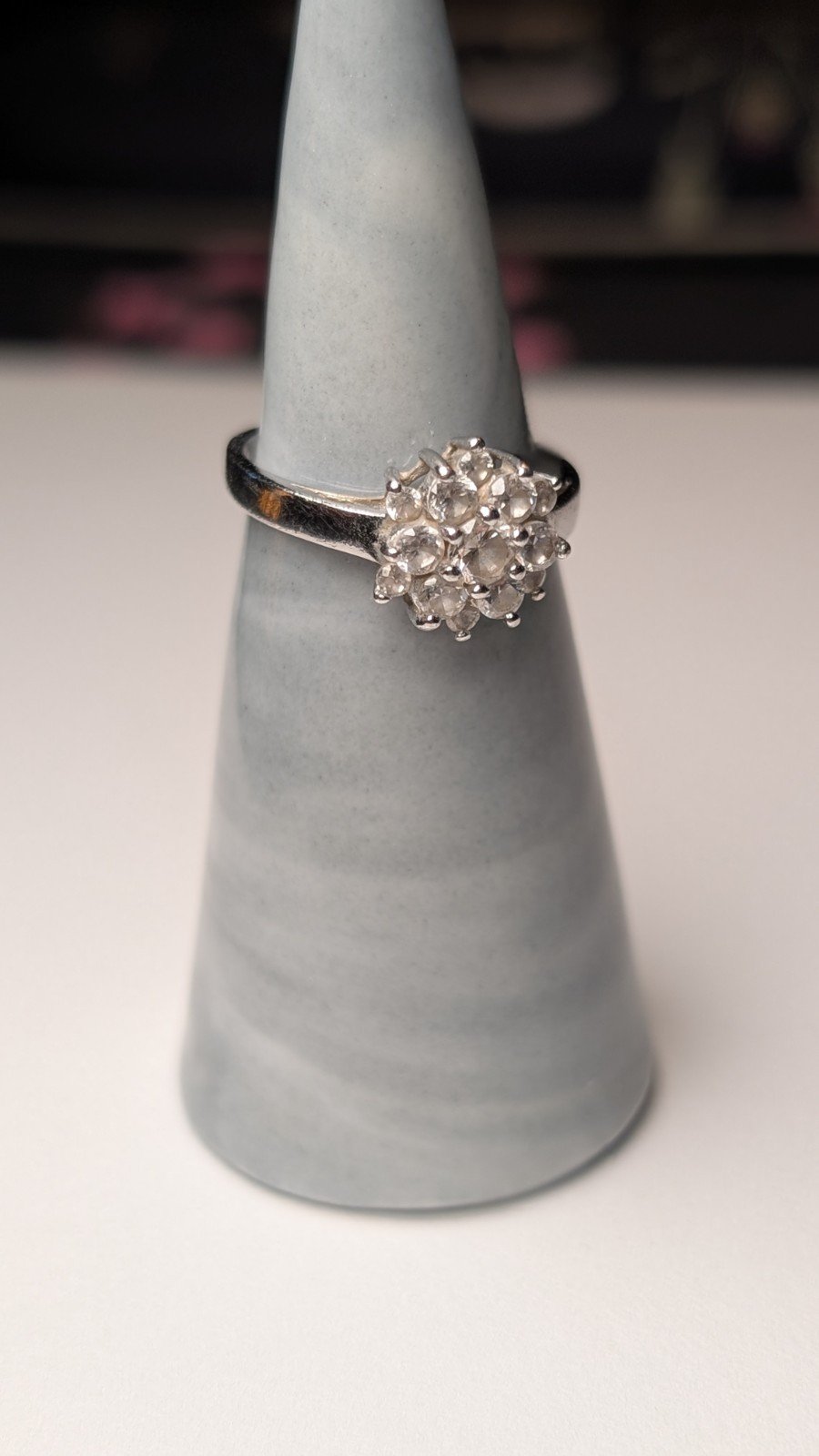 This vintage sterling silver clear cluster ring, with a ring size of M 1/2, is a beautiful piece of gemstone jewellery.
