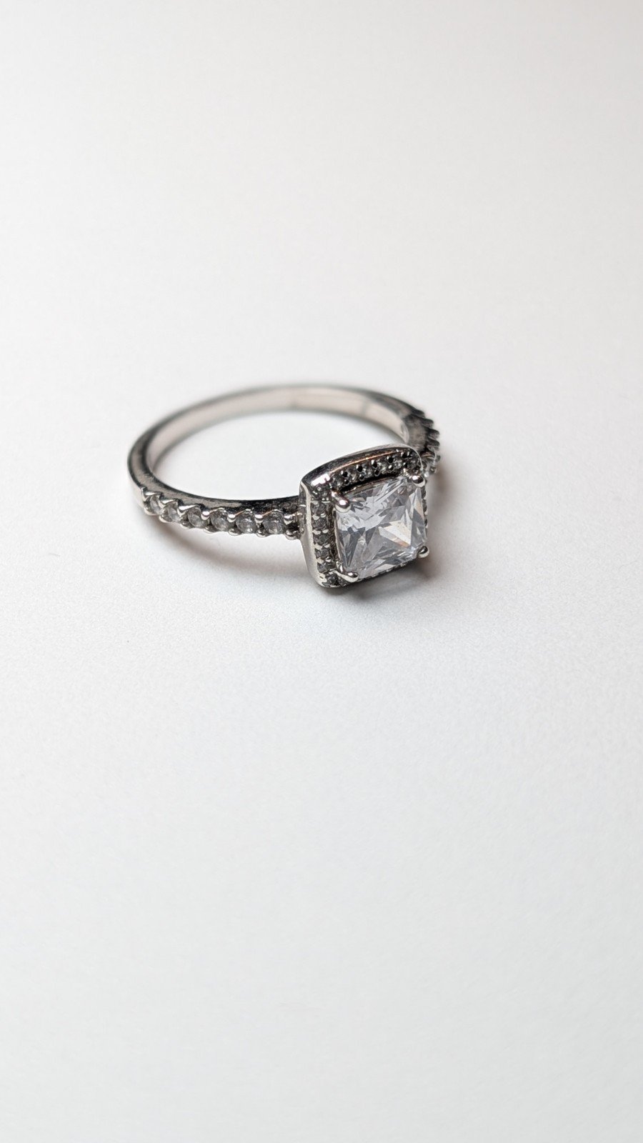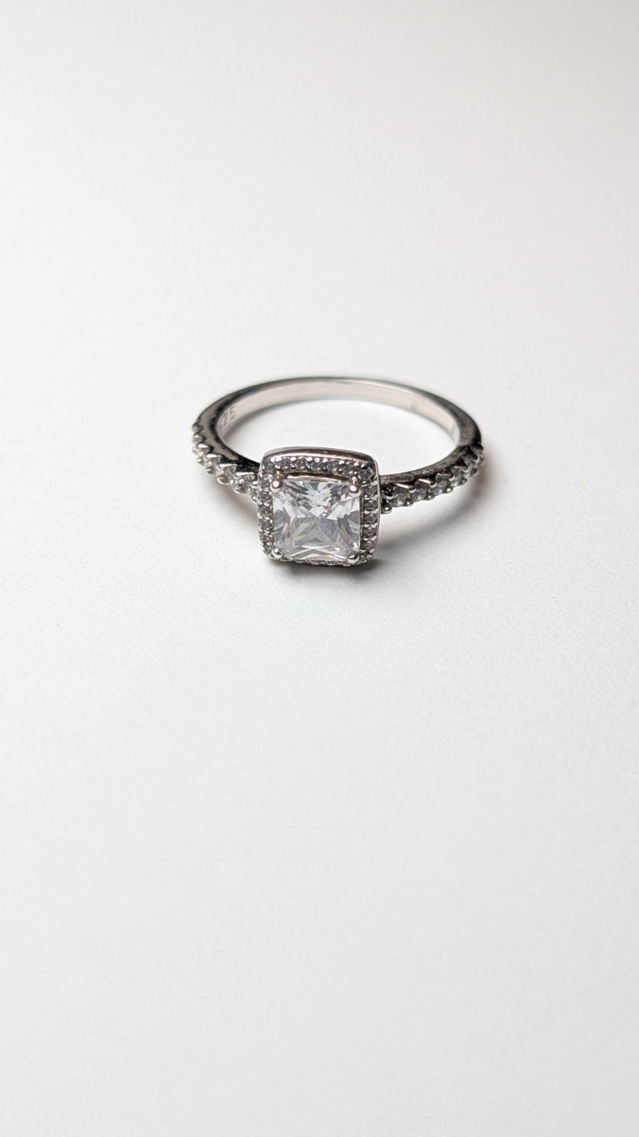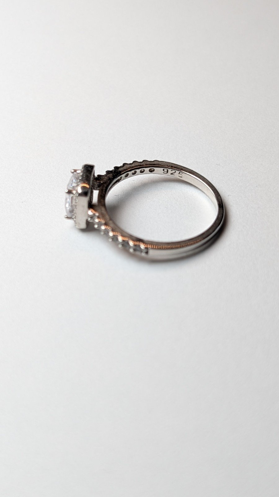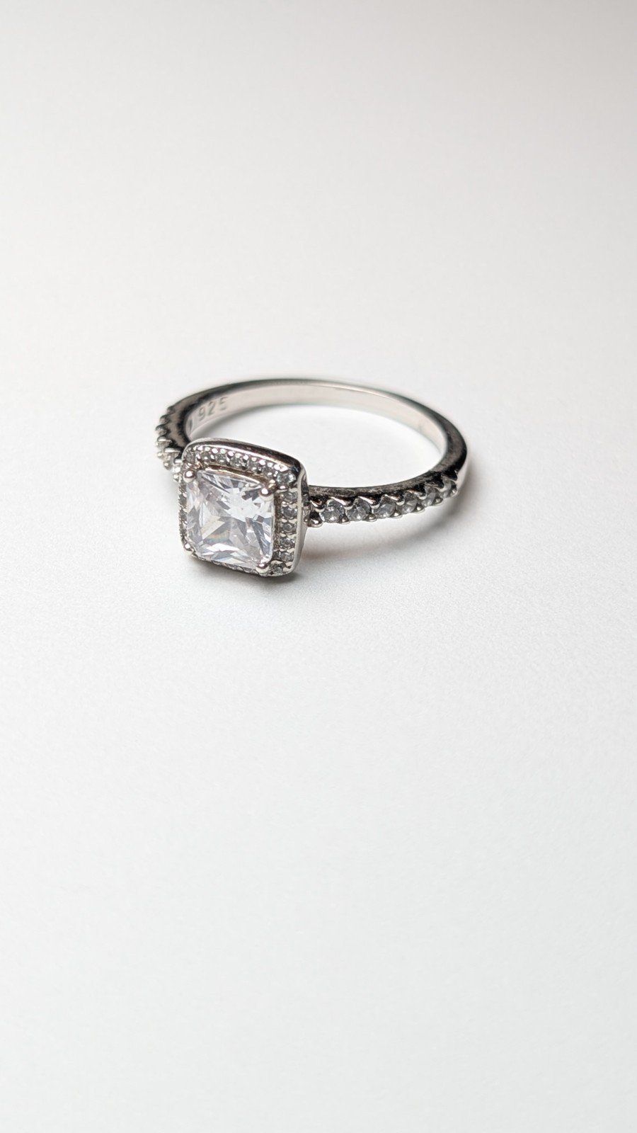 The ring is hallmarked, made from 925 silver, and features a white/colorless gemstone set in a halo style setting.