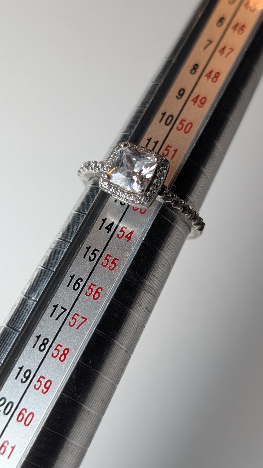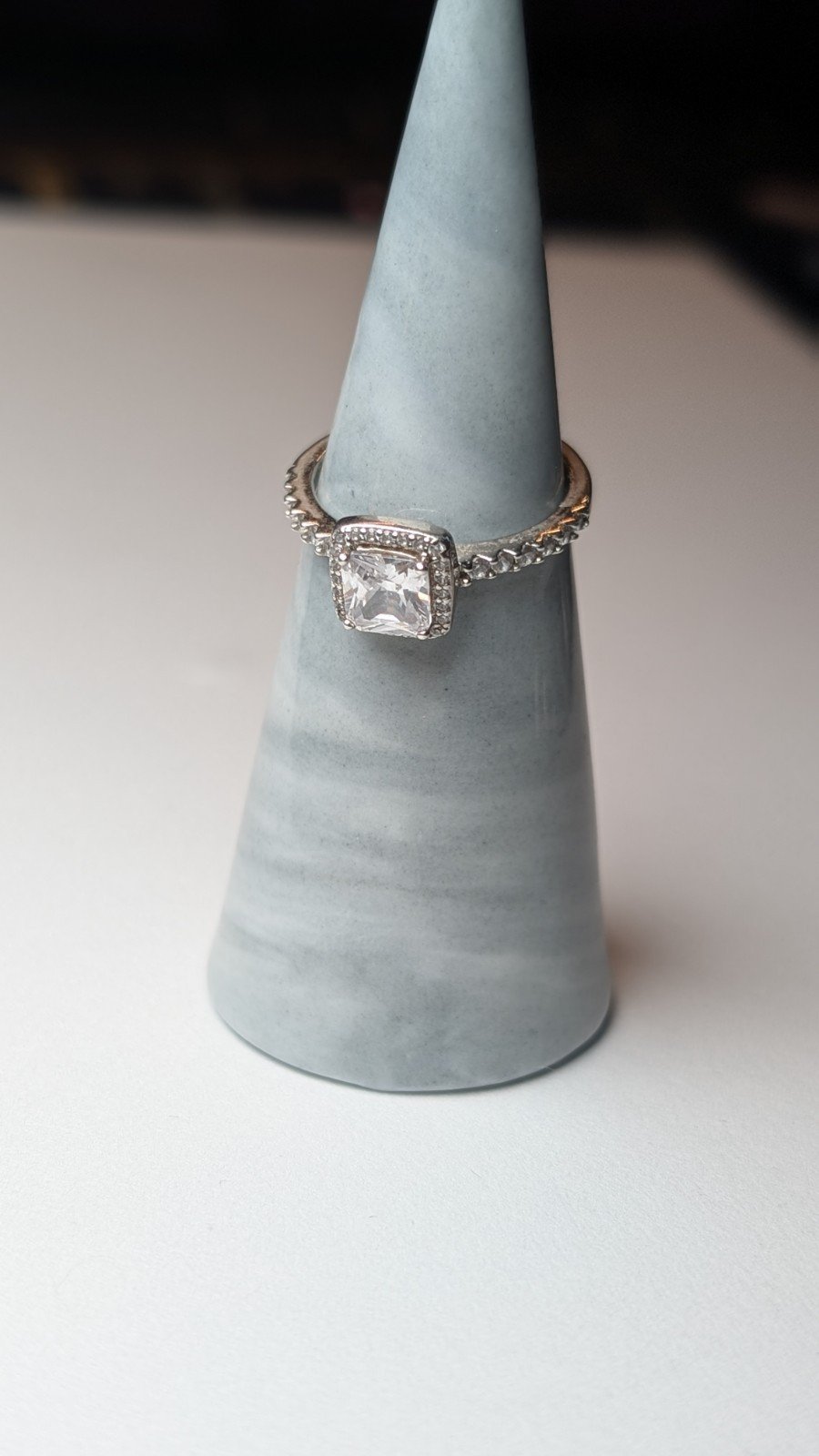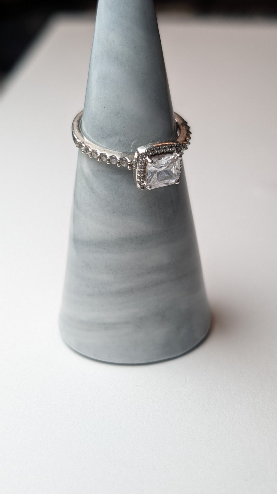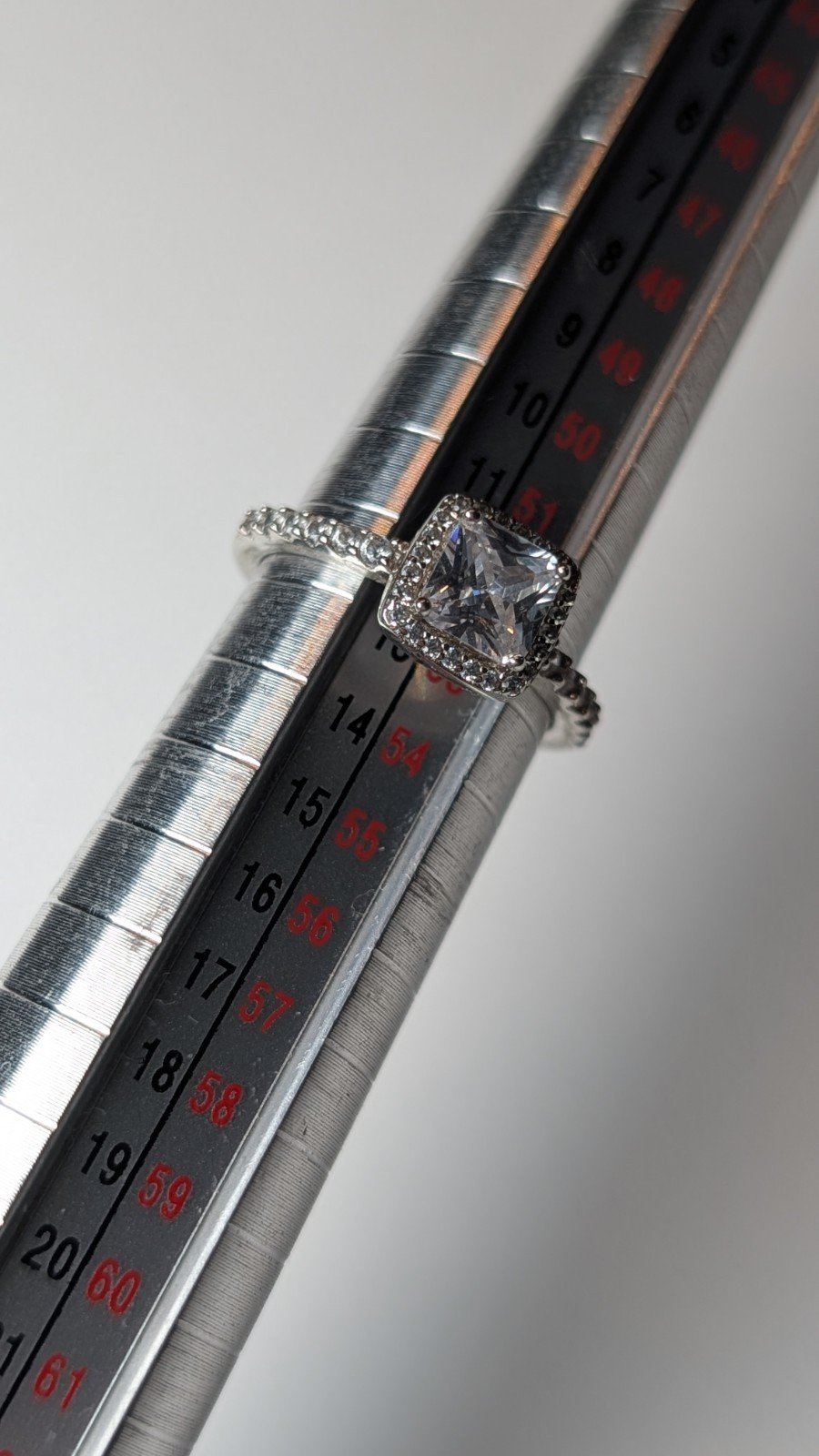 The ring is hallmarked, made from 925 silver, and features a white/colorless gemstone set in a halo style setting.