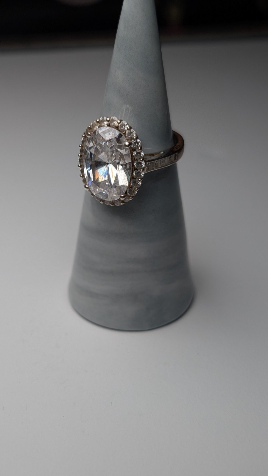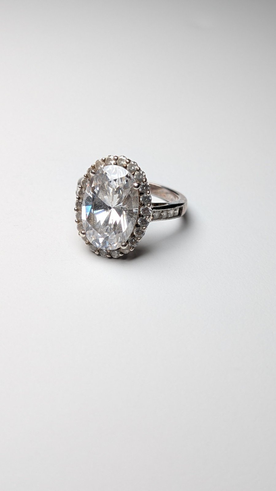 The ring features a beautiful halo setting with a white/colourless main stone, all made from 925 sterling silver.