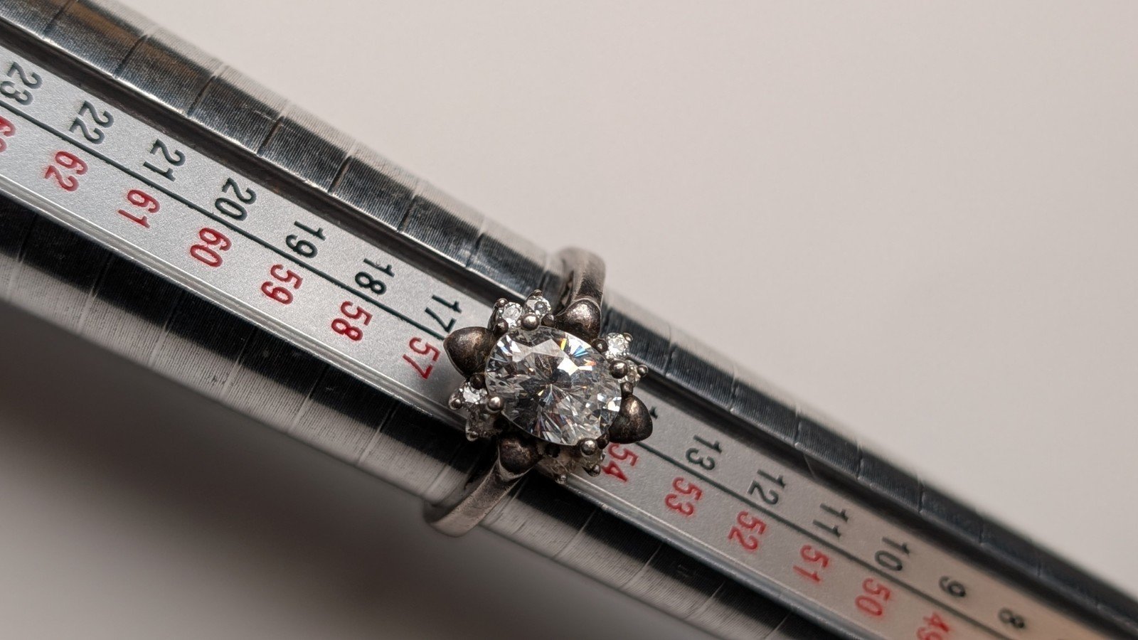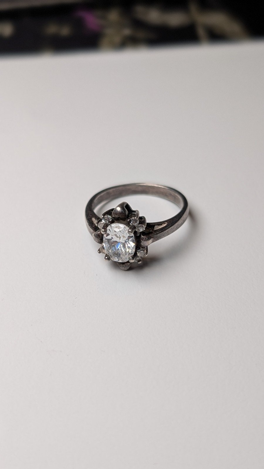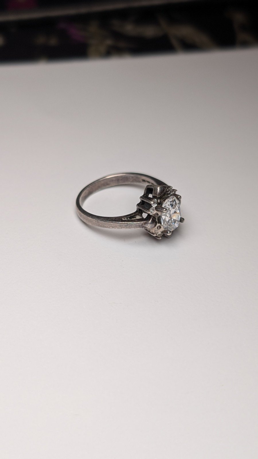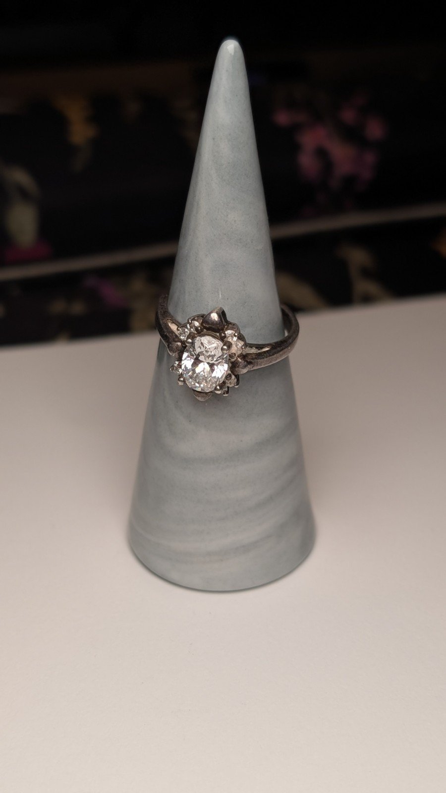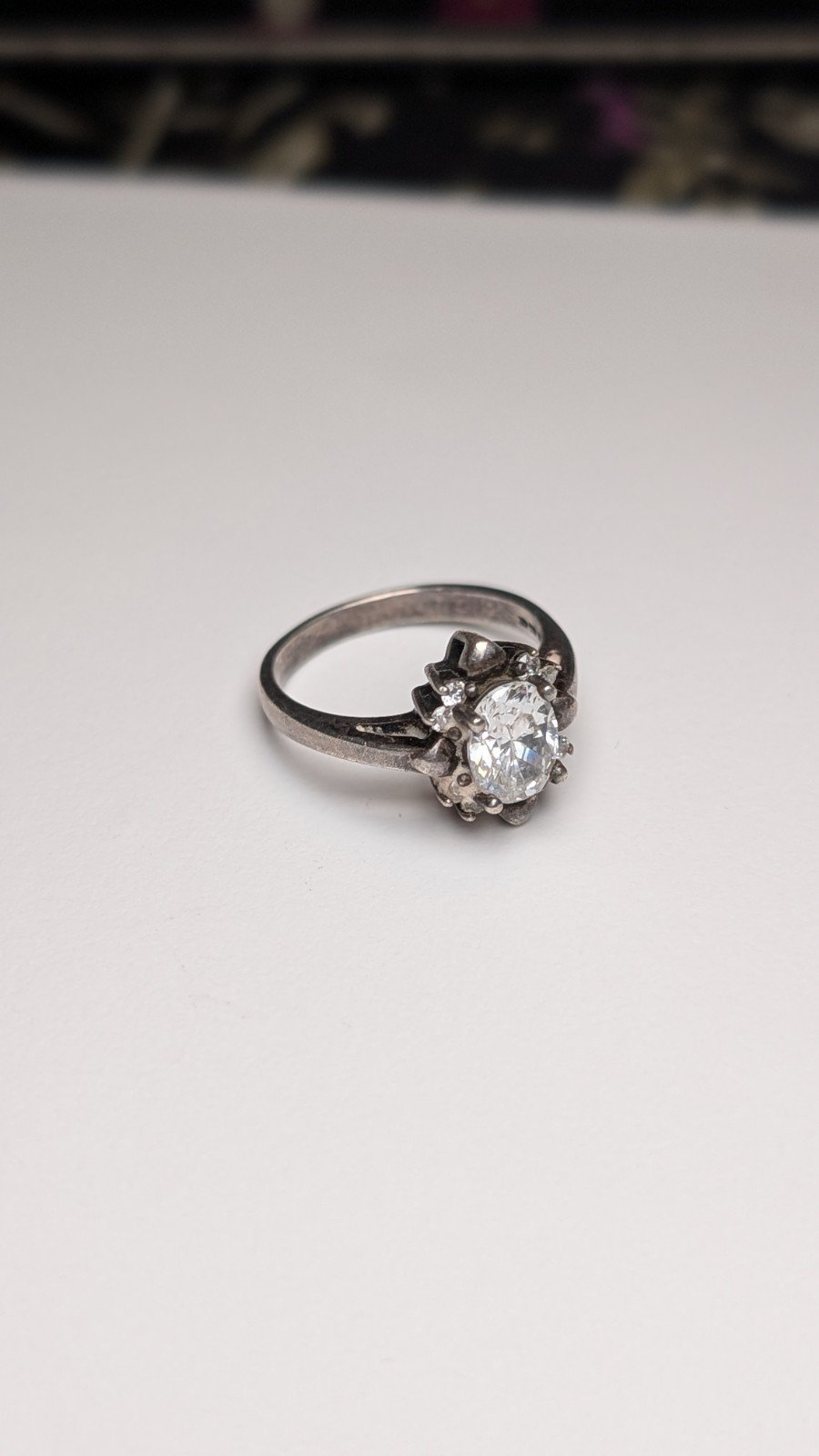 This vintage sterling silver ring features a cluster of clear white cubic zirconia gemstones set in 925 silver.