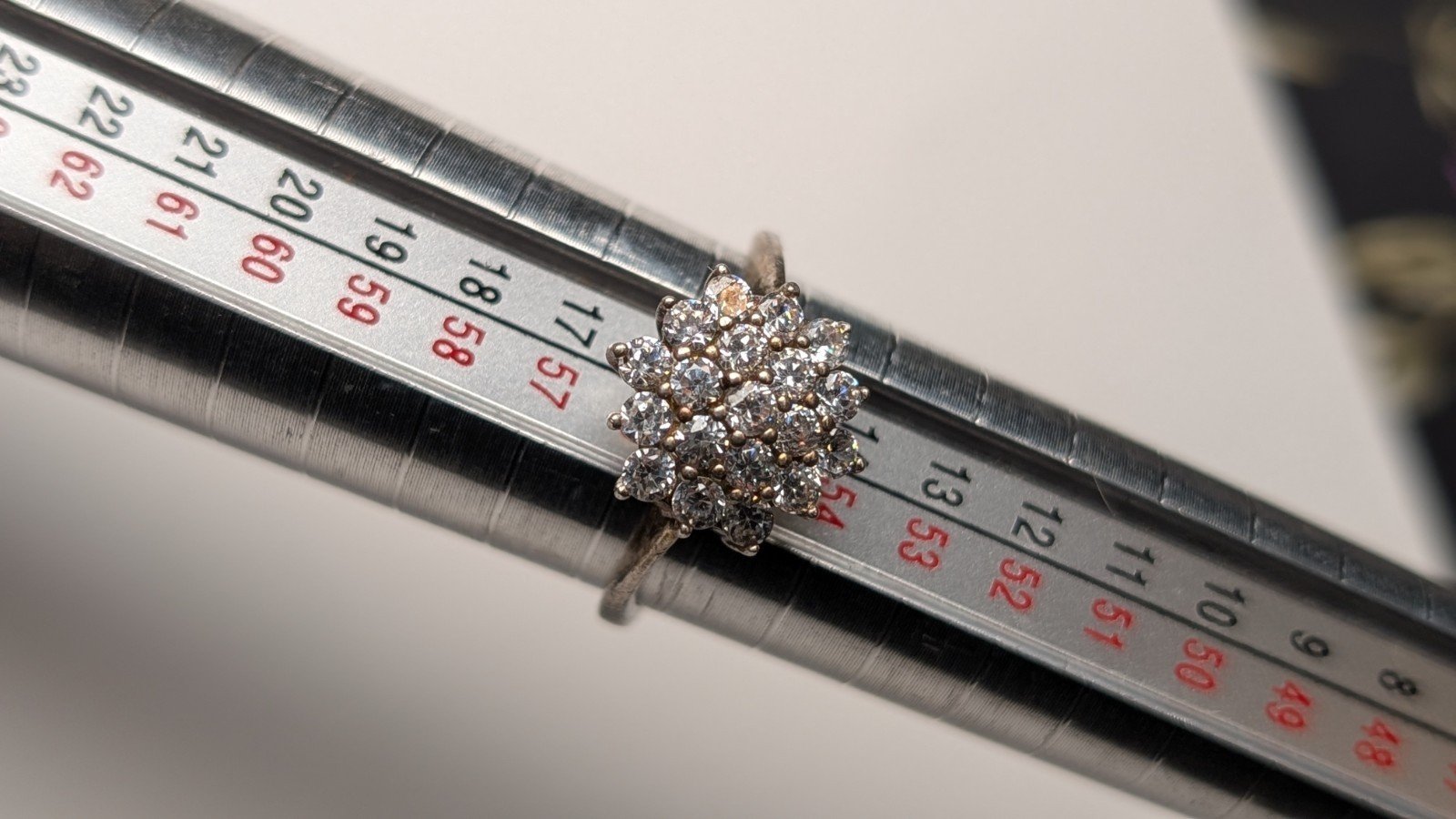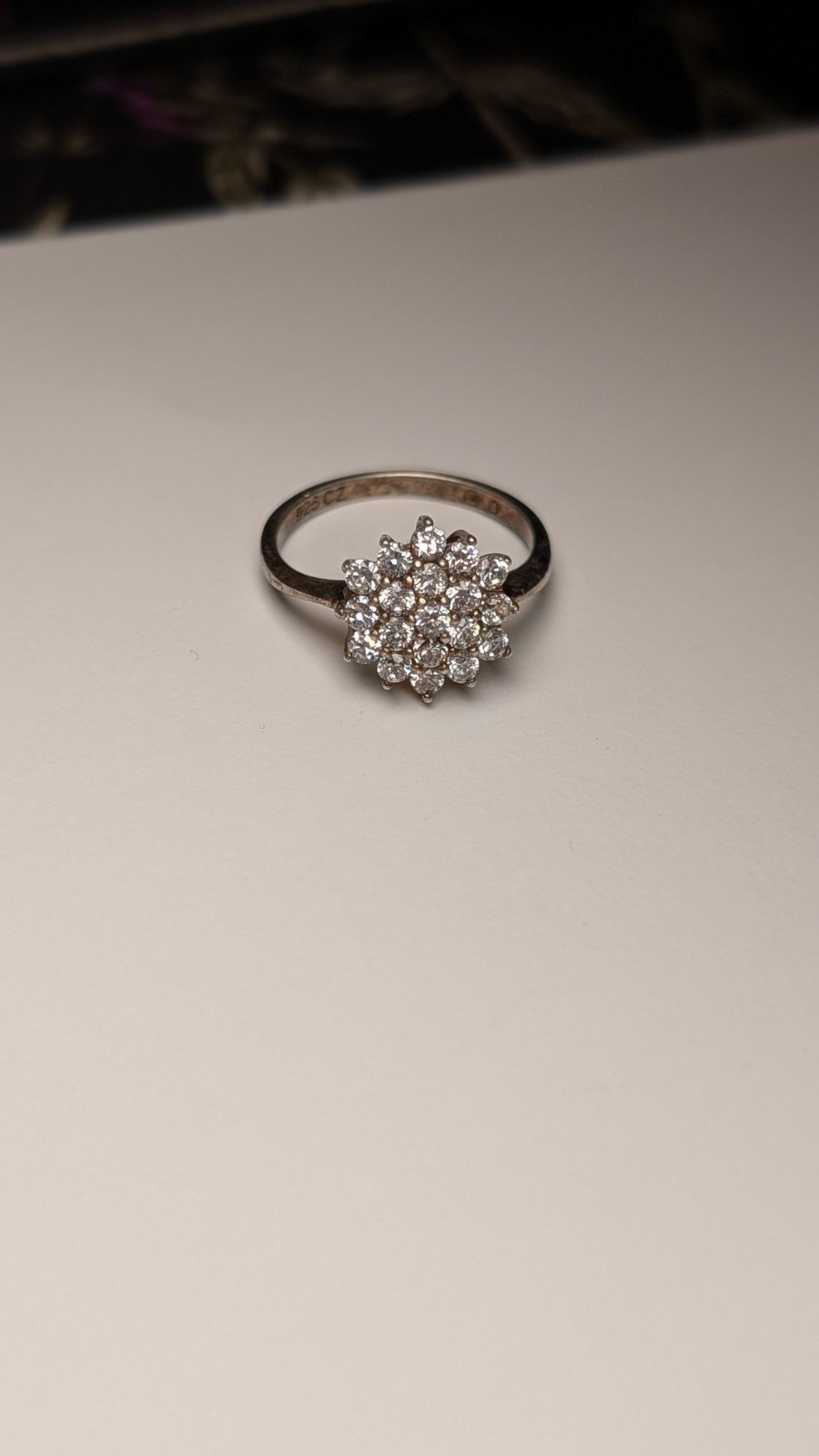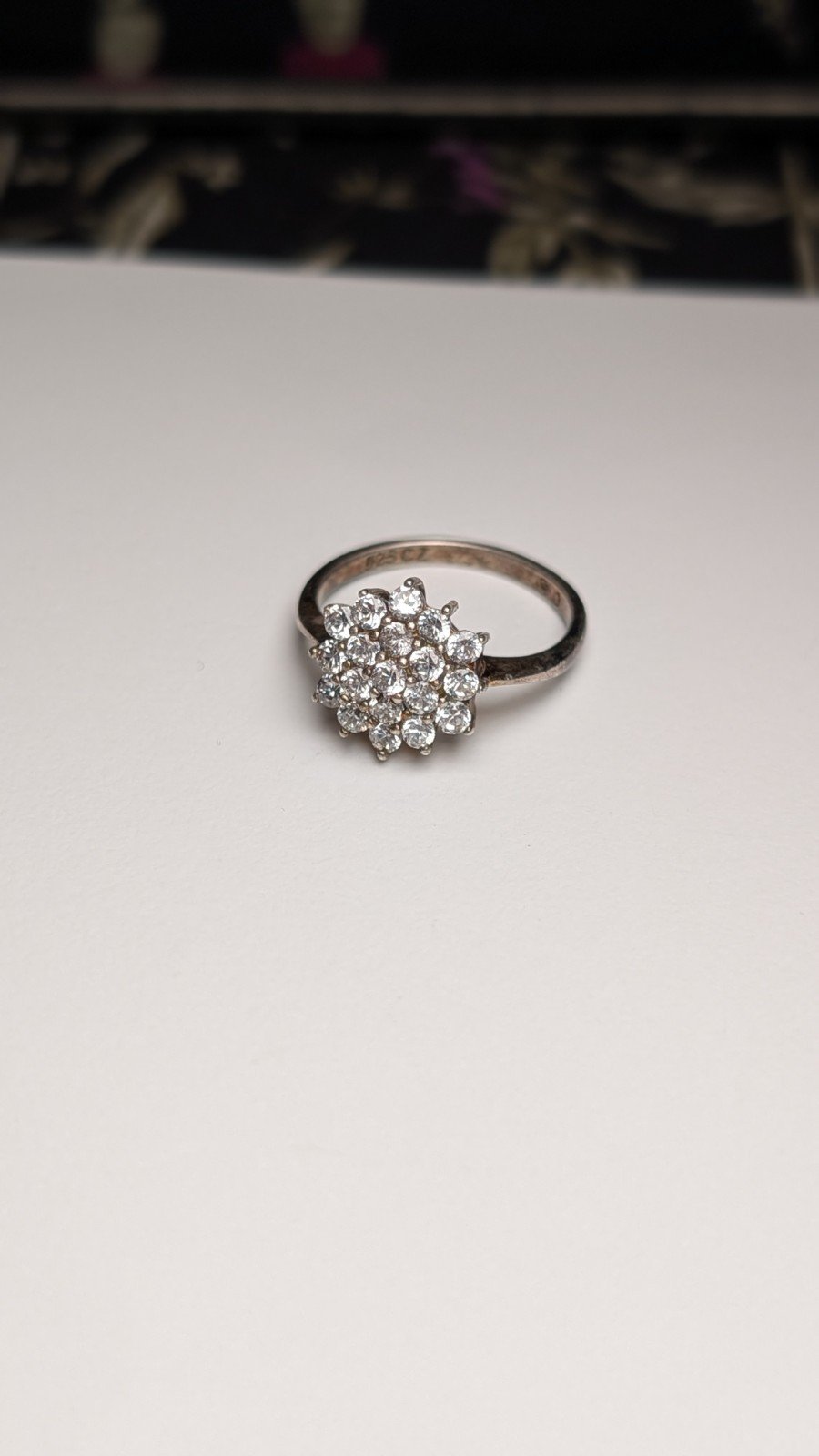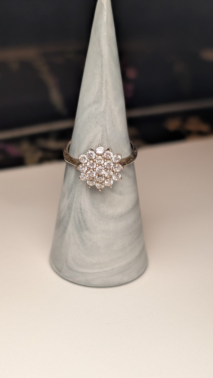 The ring is hallmarked and has a classic cluster setting style, making it a timeless and elegant addition to any collection.