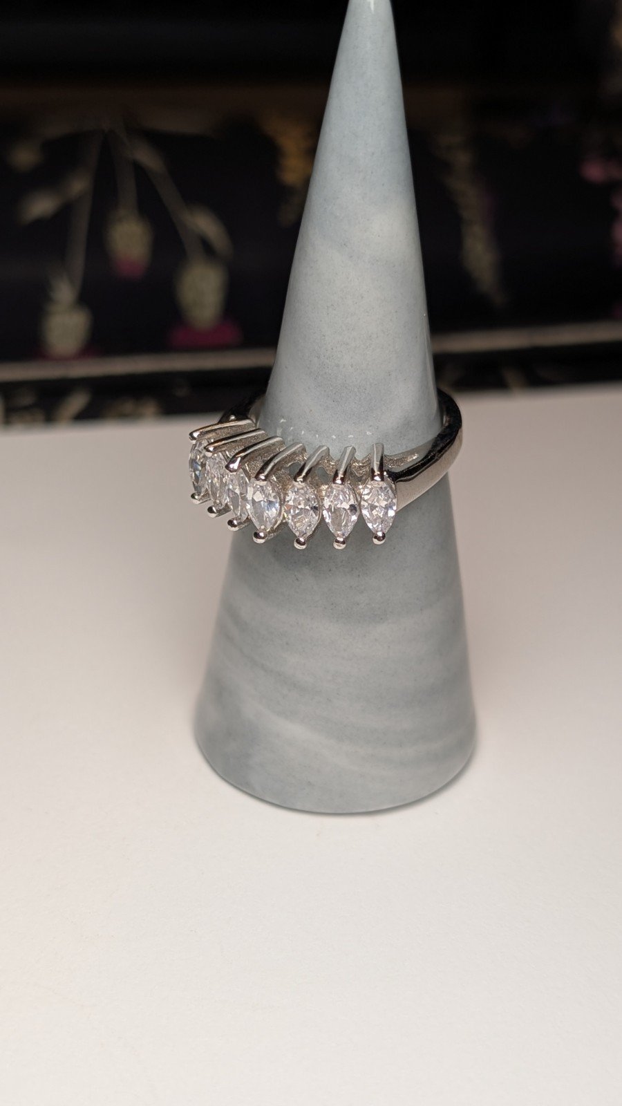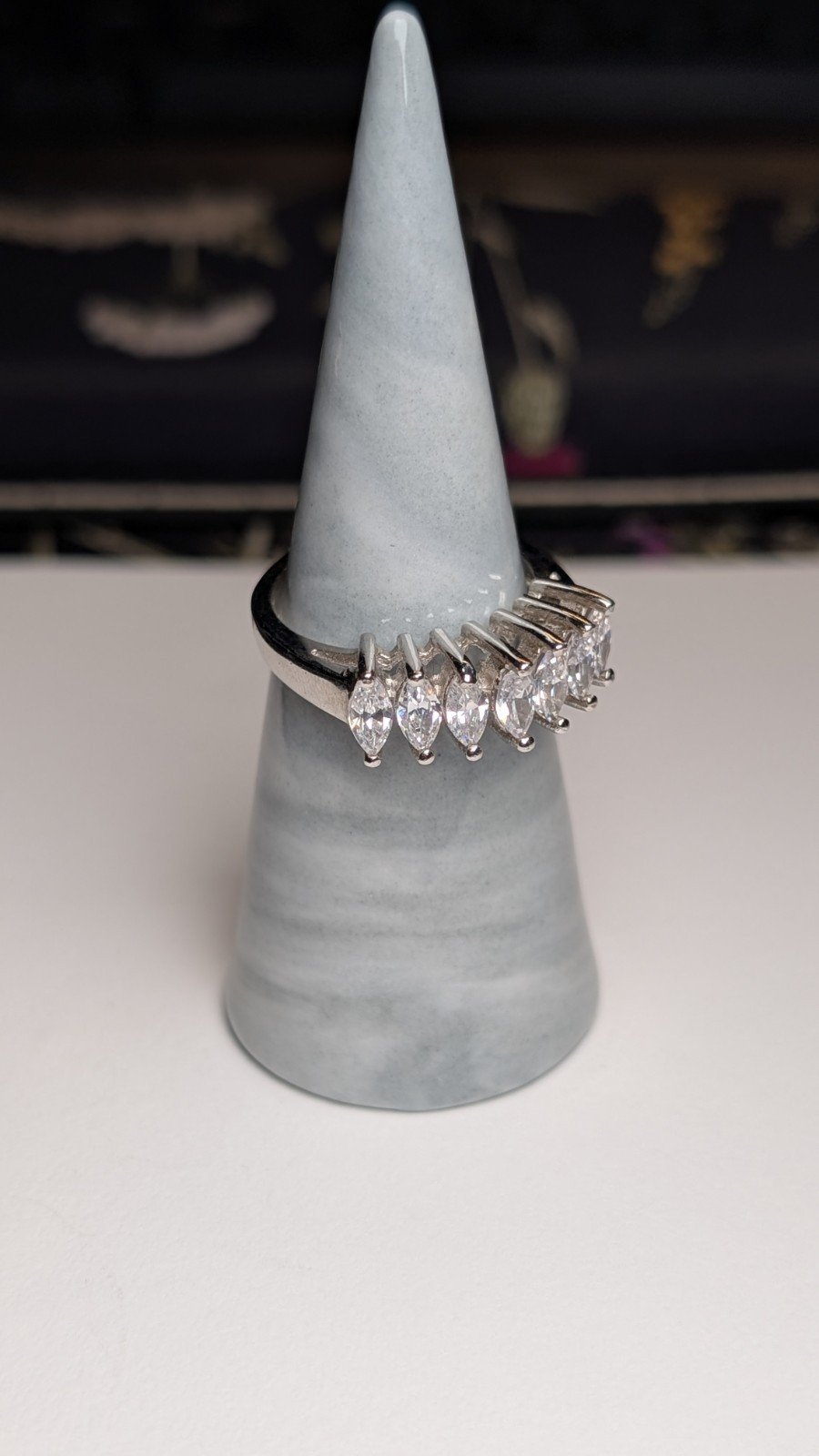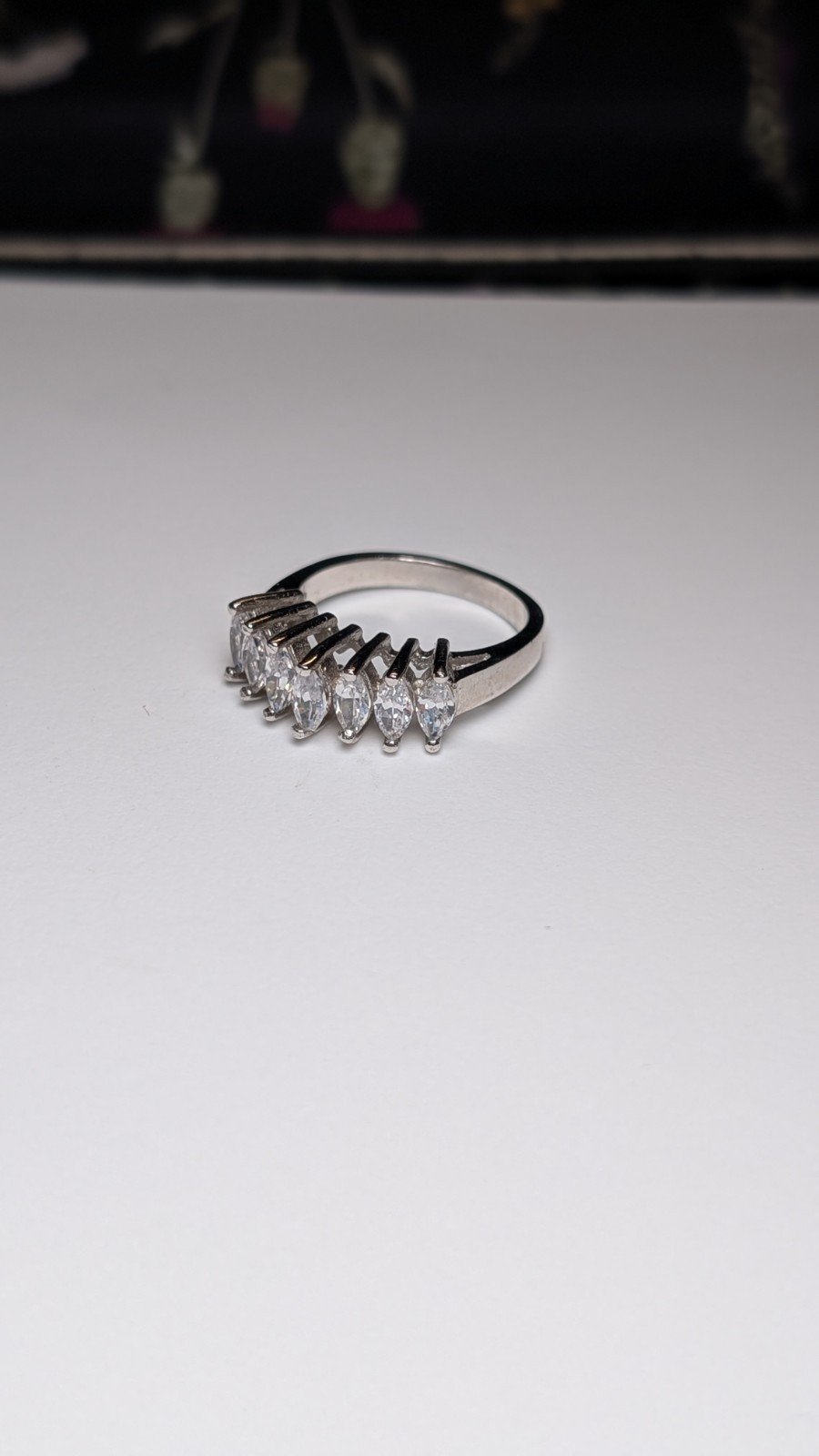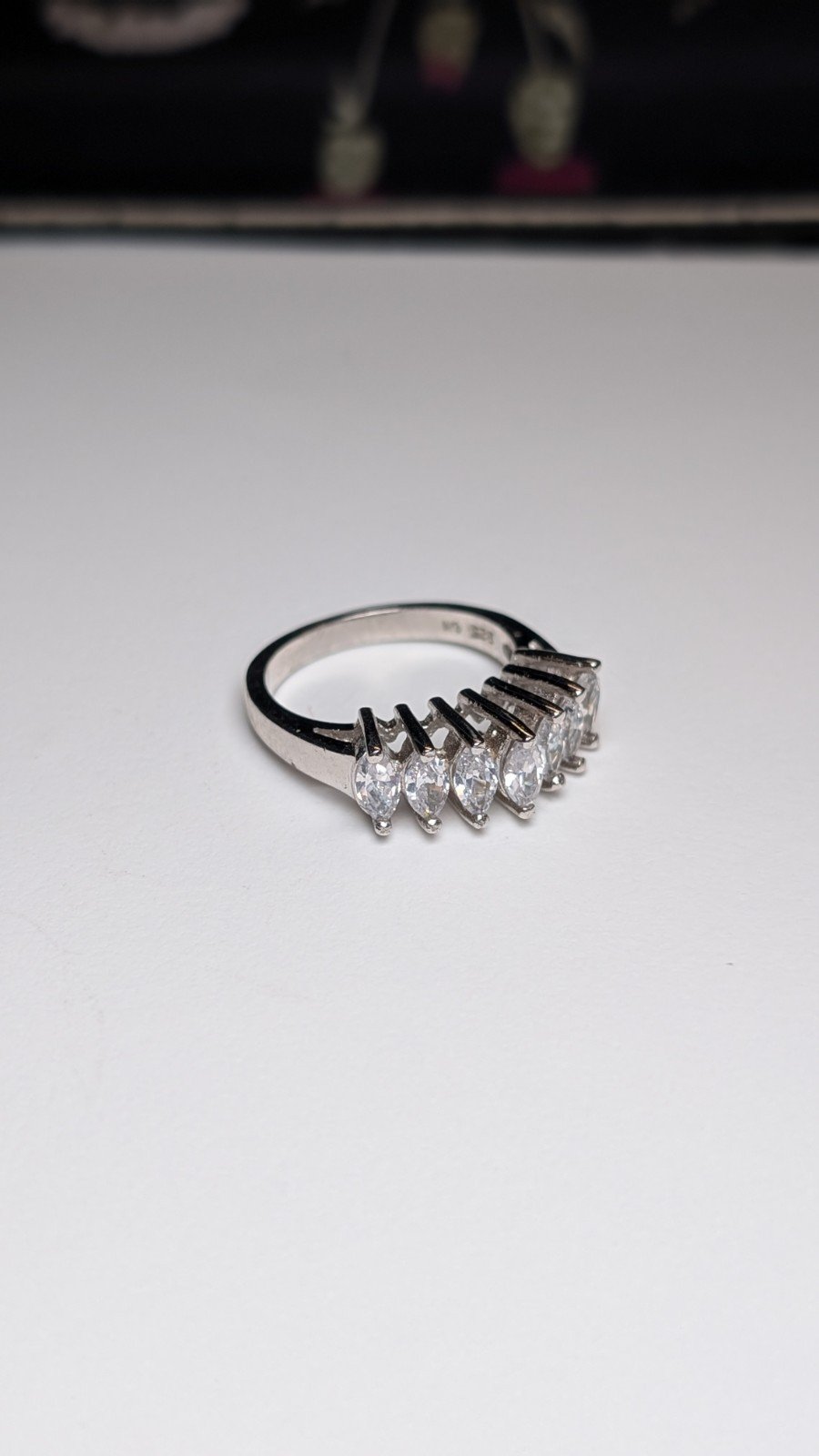 This vintage sterling silver ring features beautiful cubic zirconia stones in a white/colourless hue, set on a classic band design.