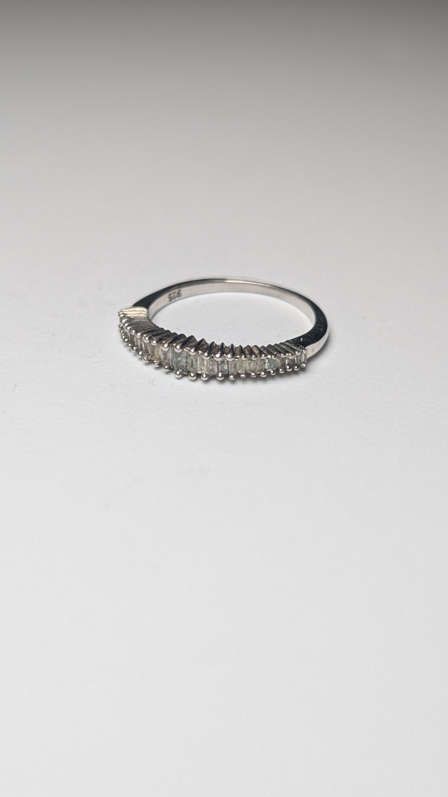 The ring is hallmarked, ensuring its authenticity and quality, made from 925 sterling silver with a beautiful clear gemstone set in a baguette shape.