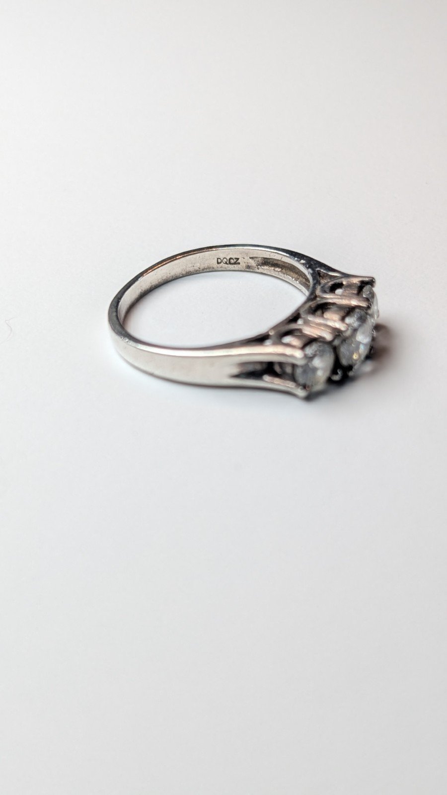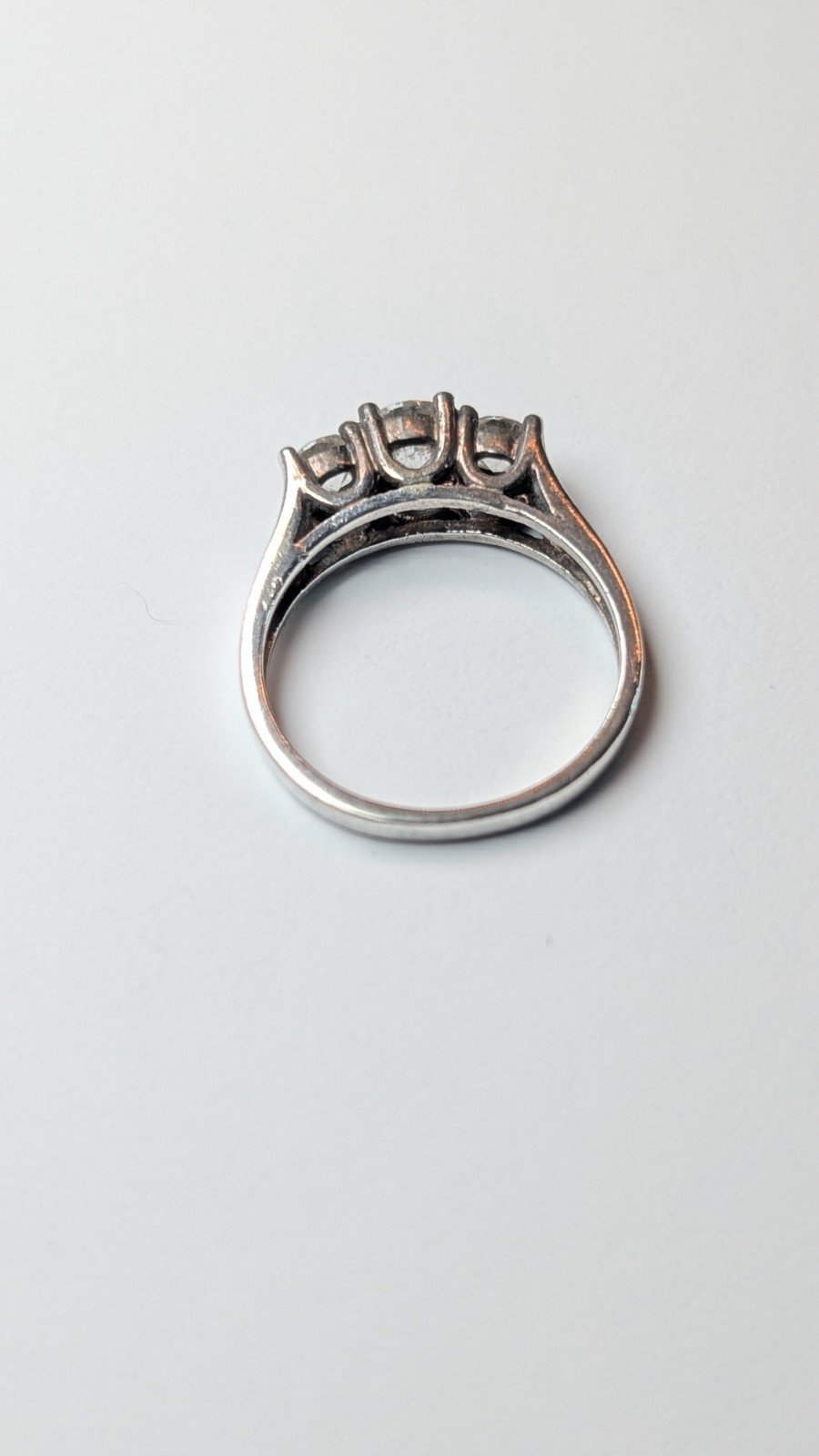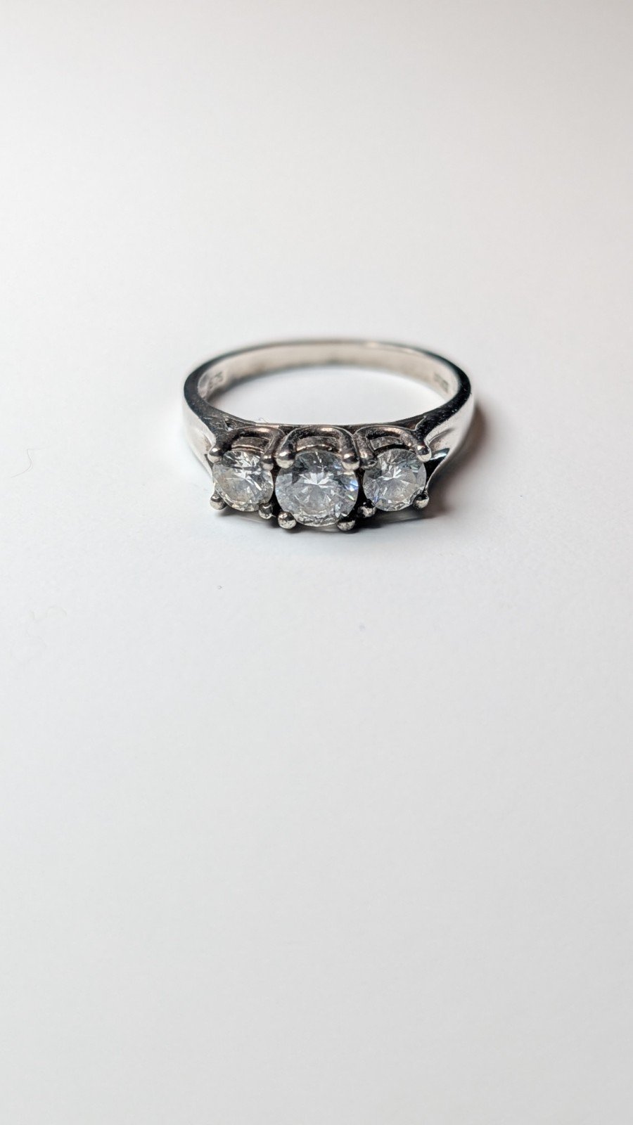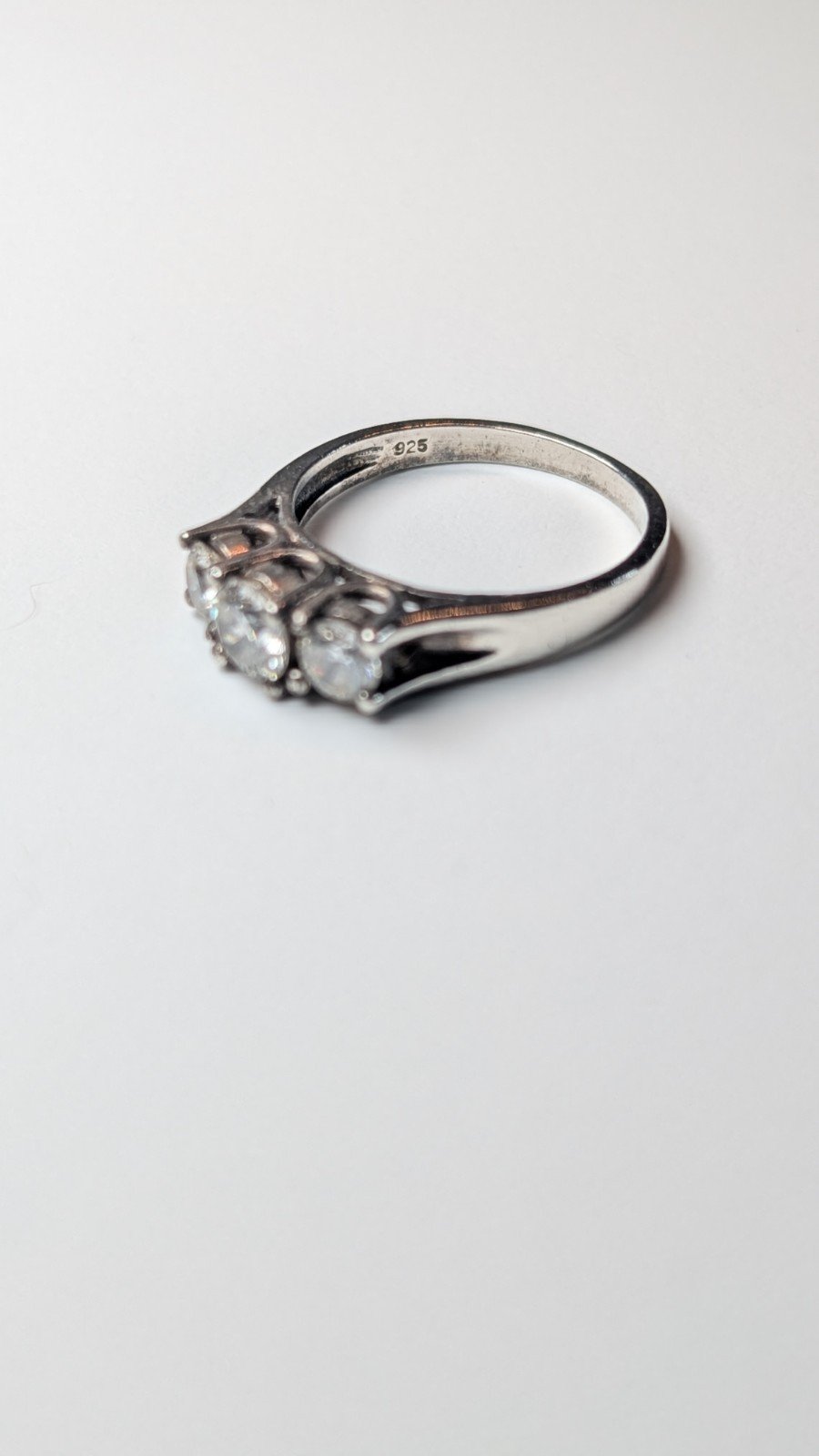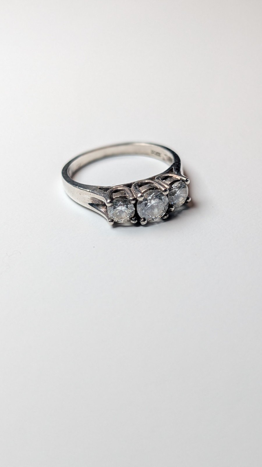This vintage sterling silver CZ 3 stone ring is hallmarked and features a size N.