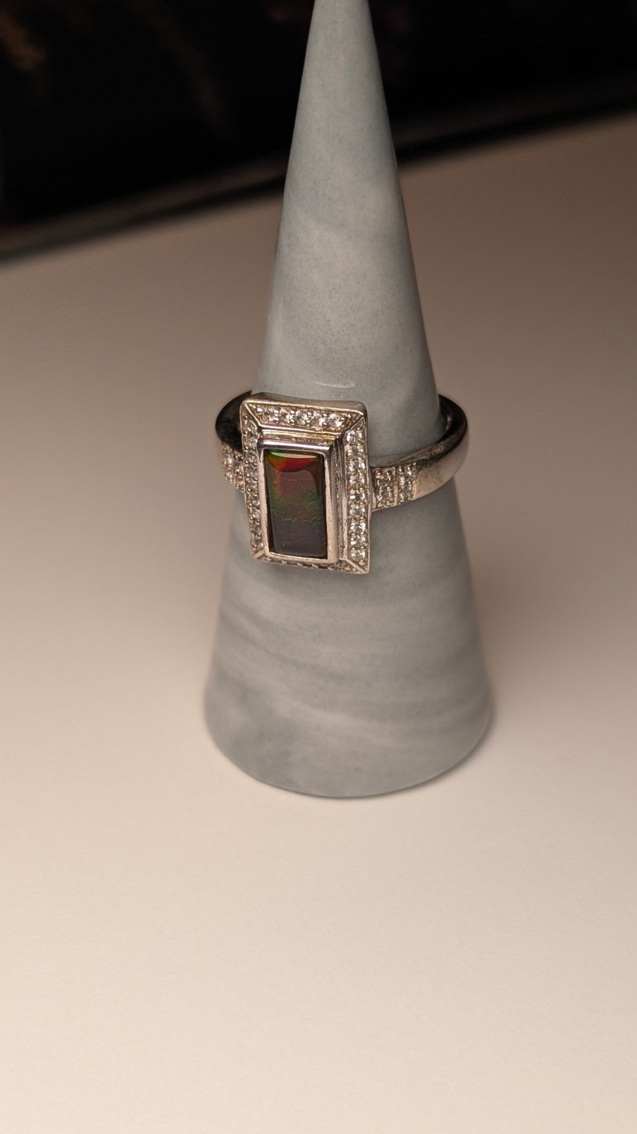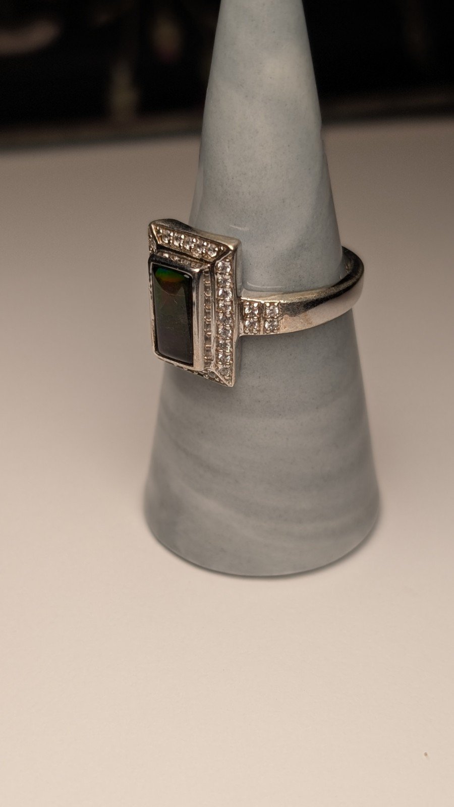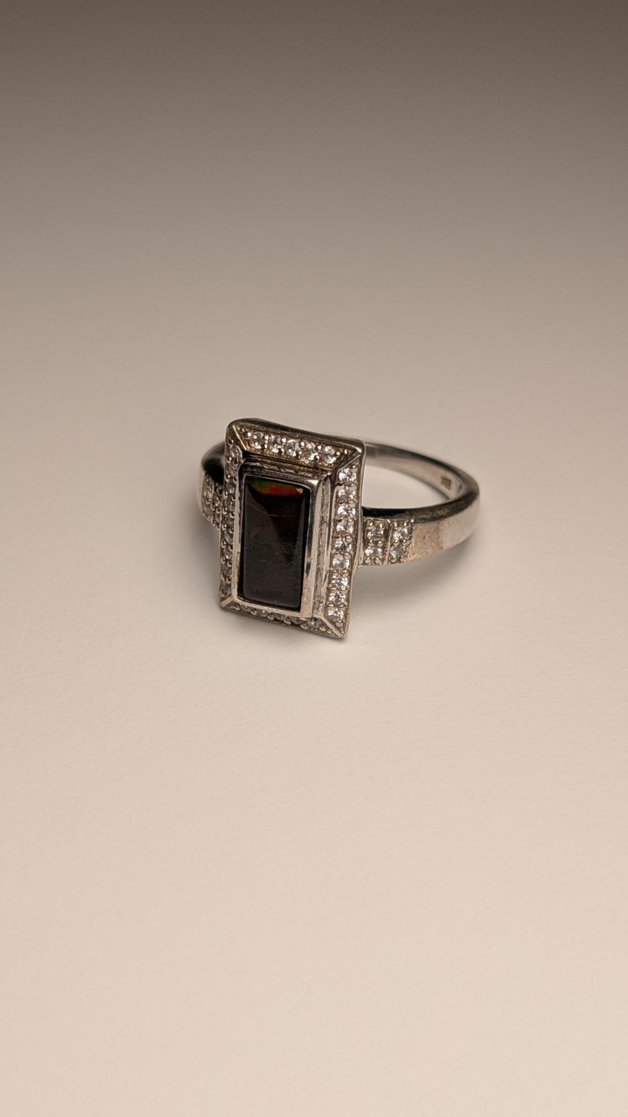 The ring is crafted from 925 sterling silver and features a beautiful multicoloured gemstone as the main focal point.