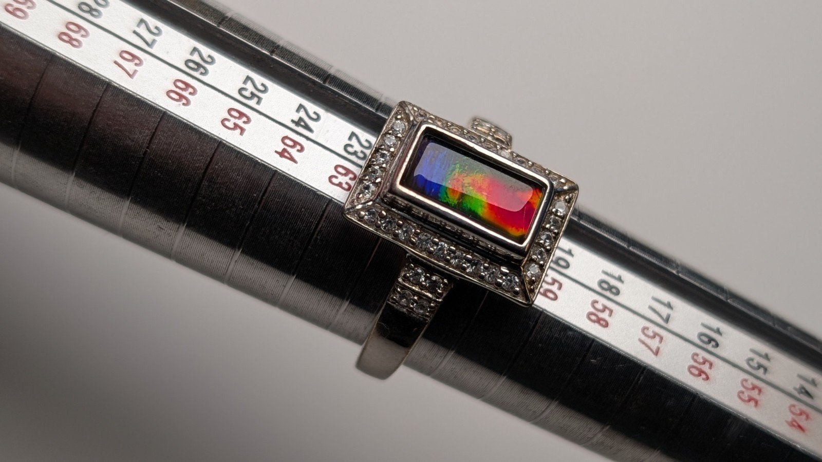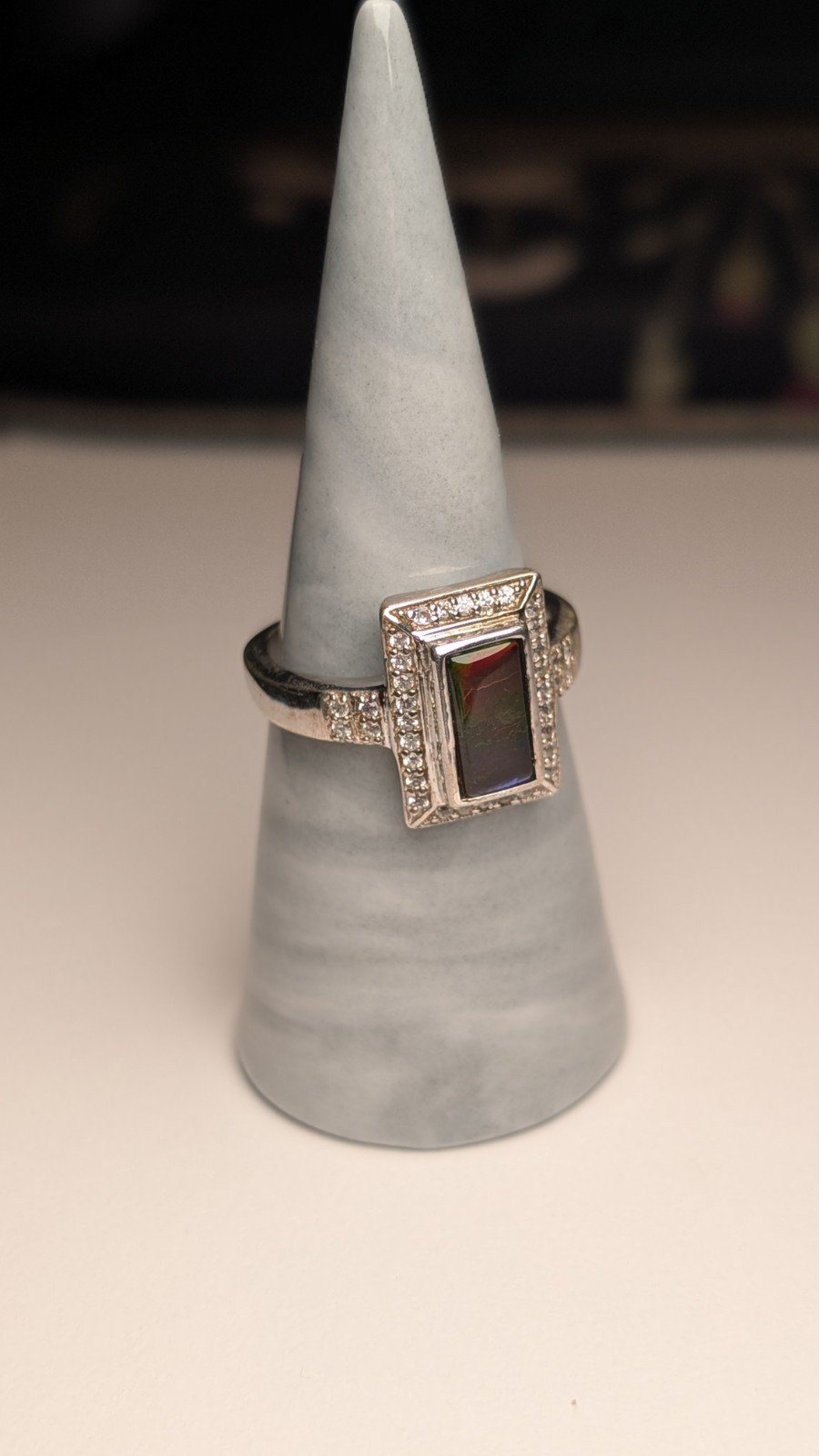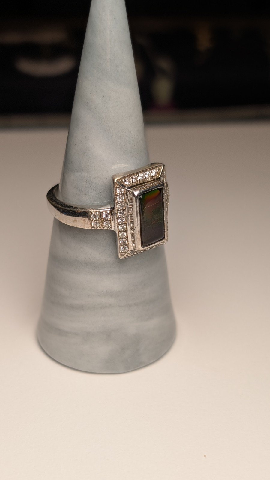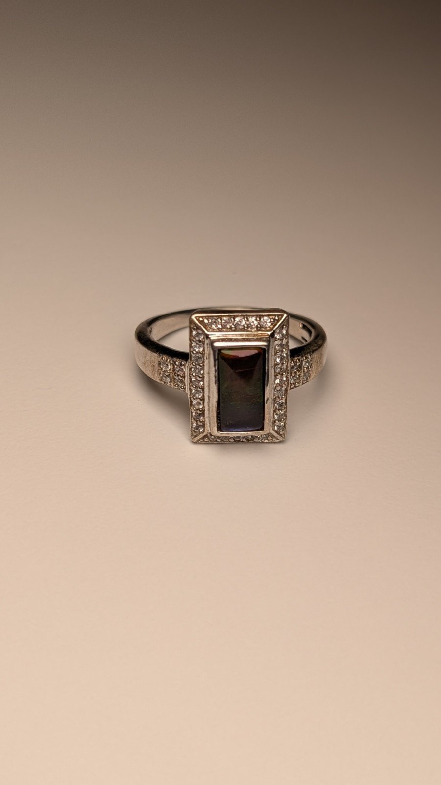 The ring is crafted from 925 sterling silver and features a beautiful multicoloured gemstone as the main focal point.