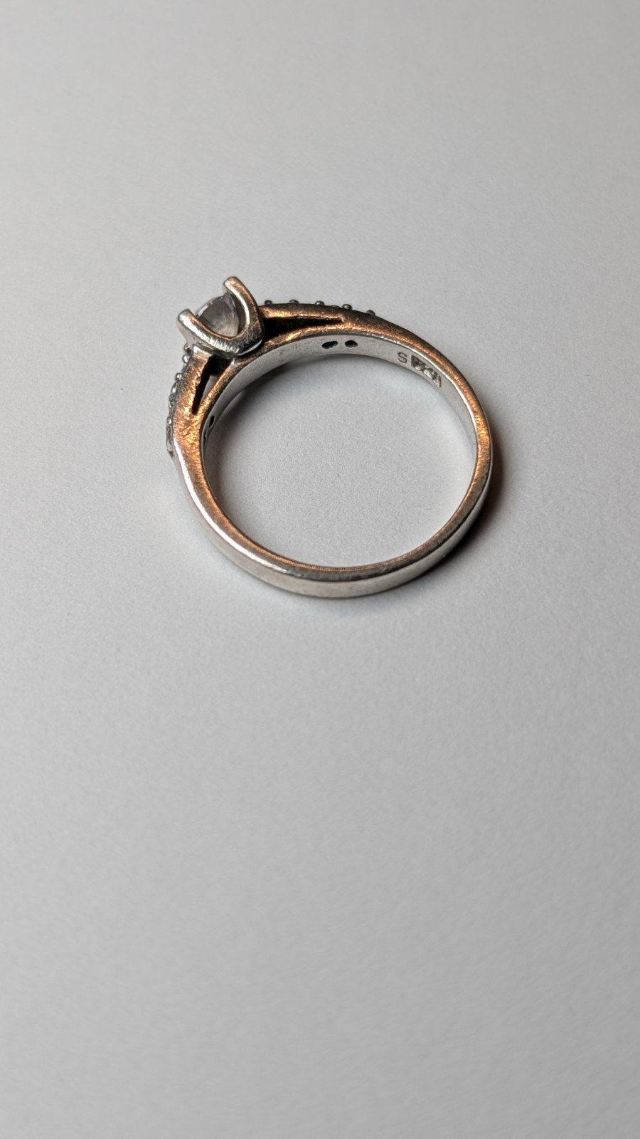 The ring features a round cubic zirconia stone set in 925 sterling silver, with a solitaire setting style.