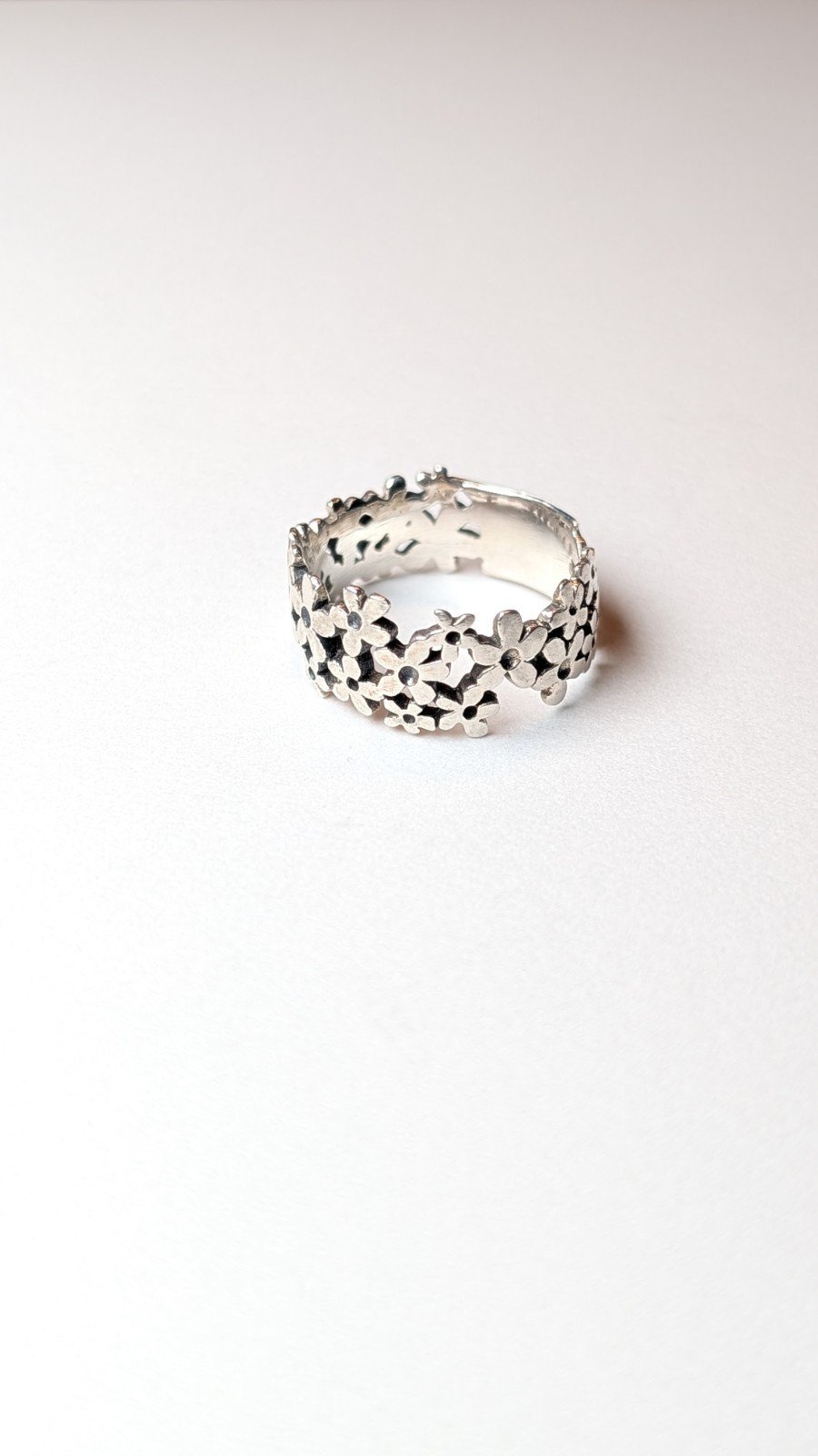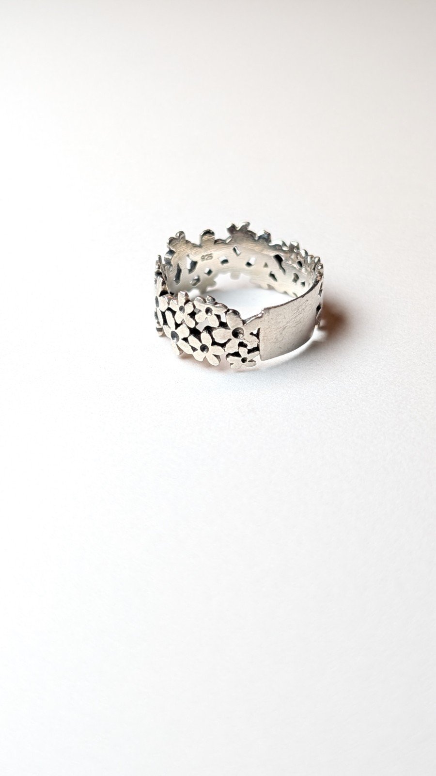 This vintage sterling silver openwork flower ring is a stunning piece of jewellery, perfect for any unisex adult looking to add a touch of elegance to their outfit.