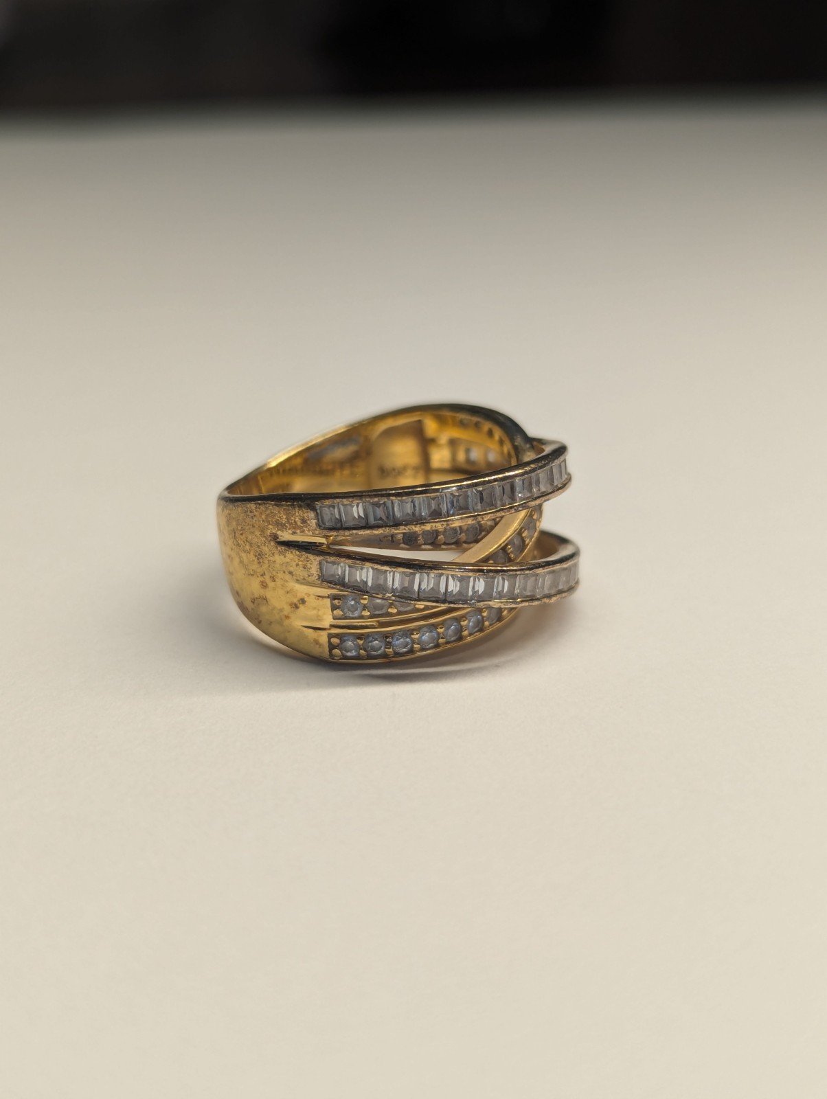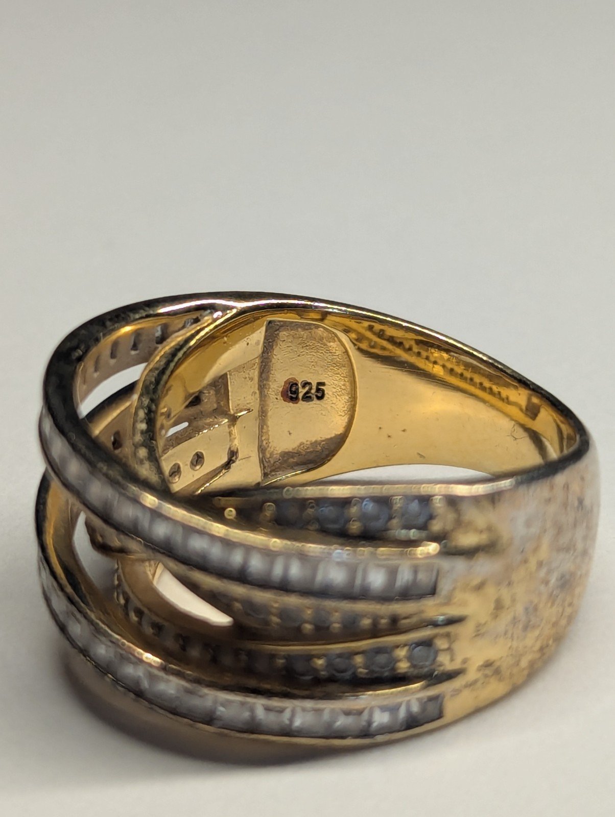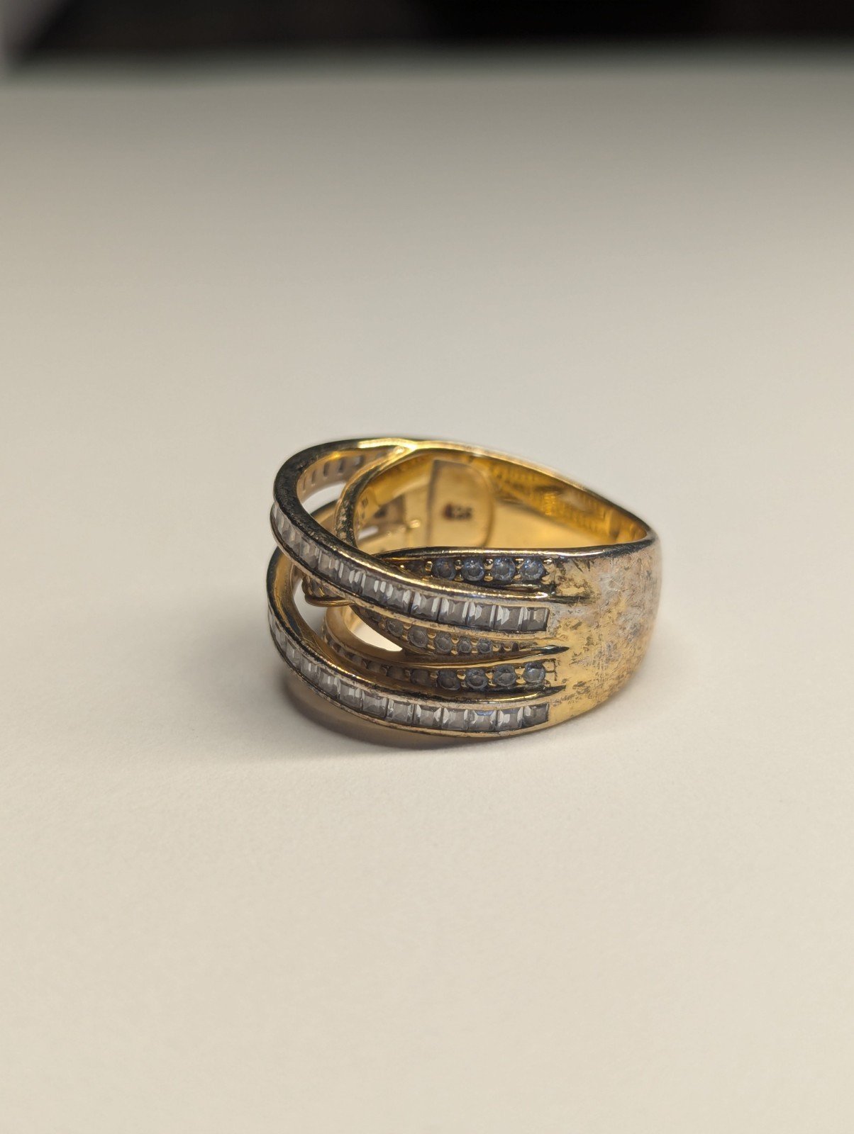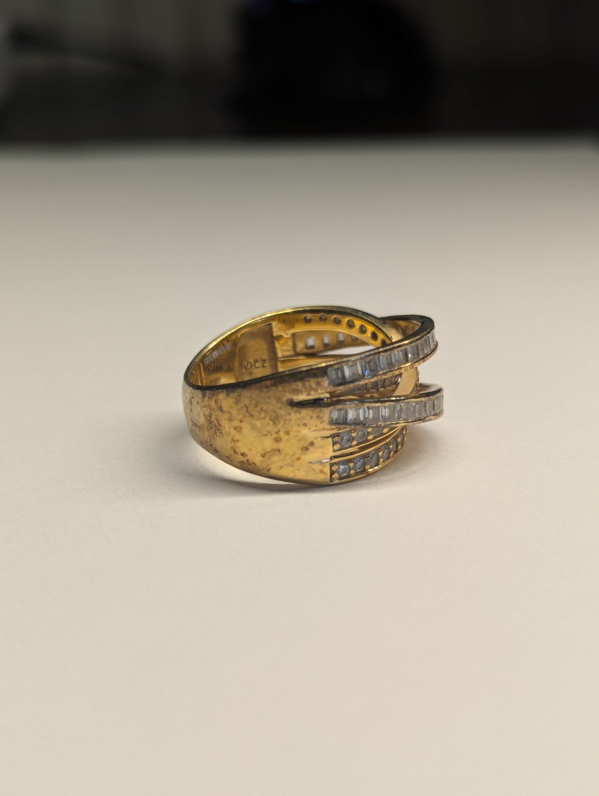This Vintage Sterling Silver Gold Tone DQCZ Ring is a stunning piece of jewellery with a timeless elegance. The ring features beautiful clear main stones set in a gold colour, creating a luxurious contrast.