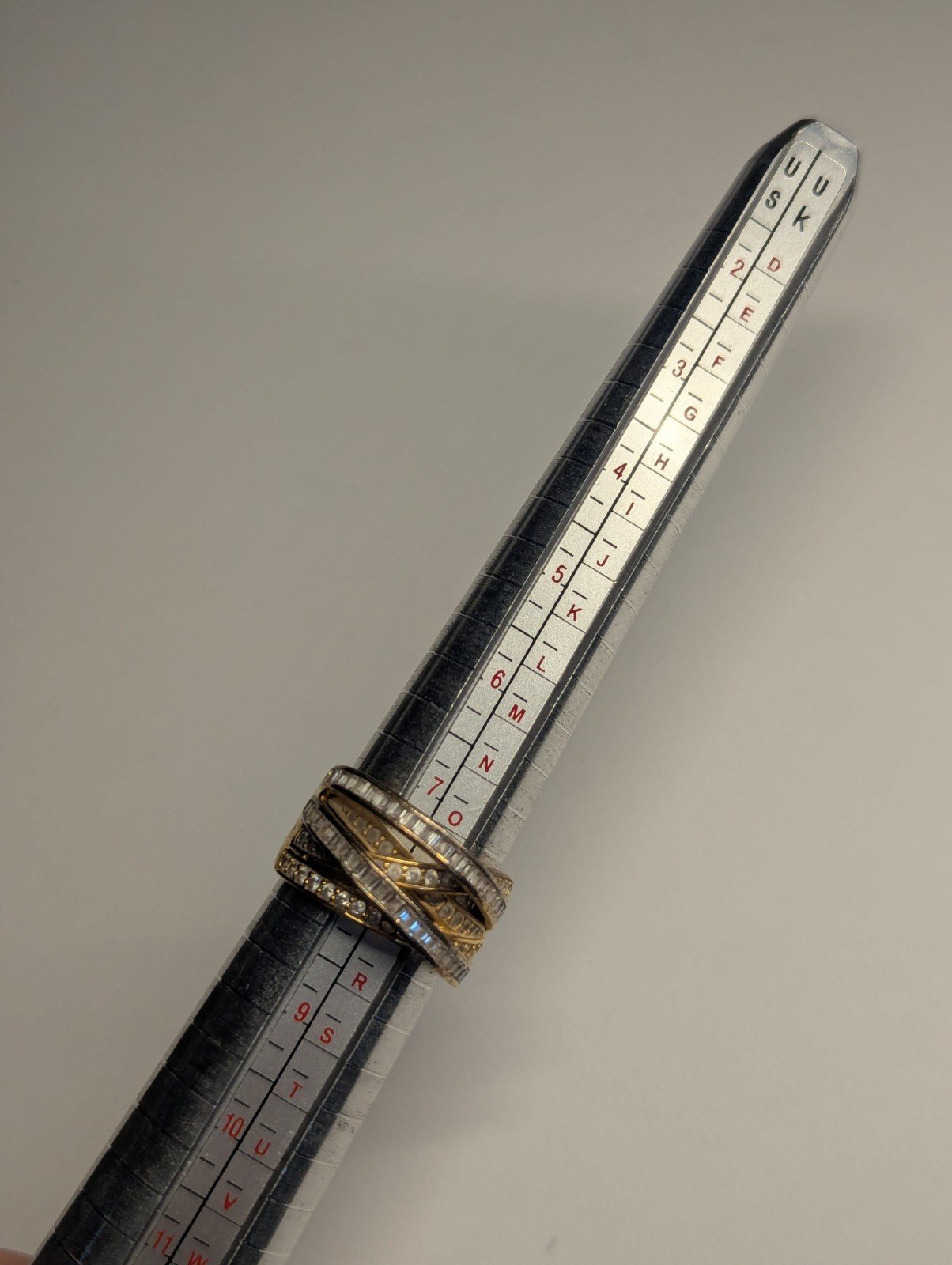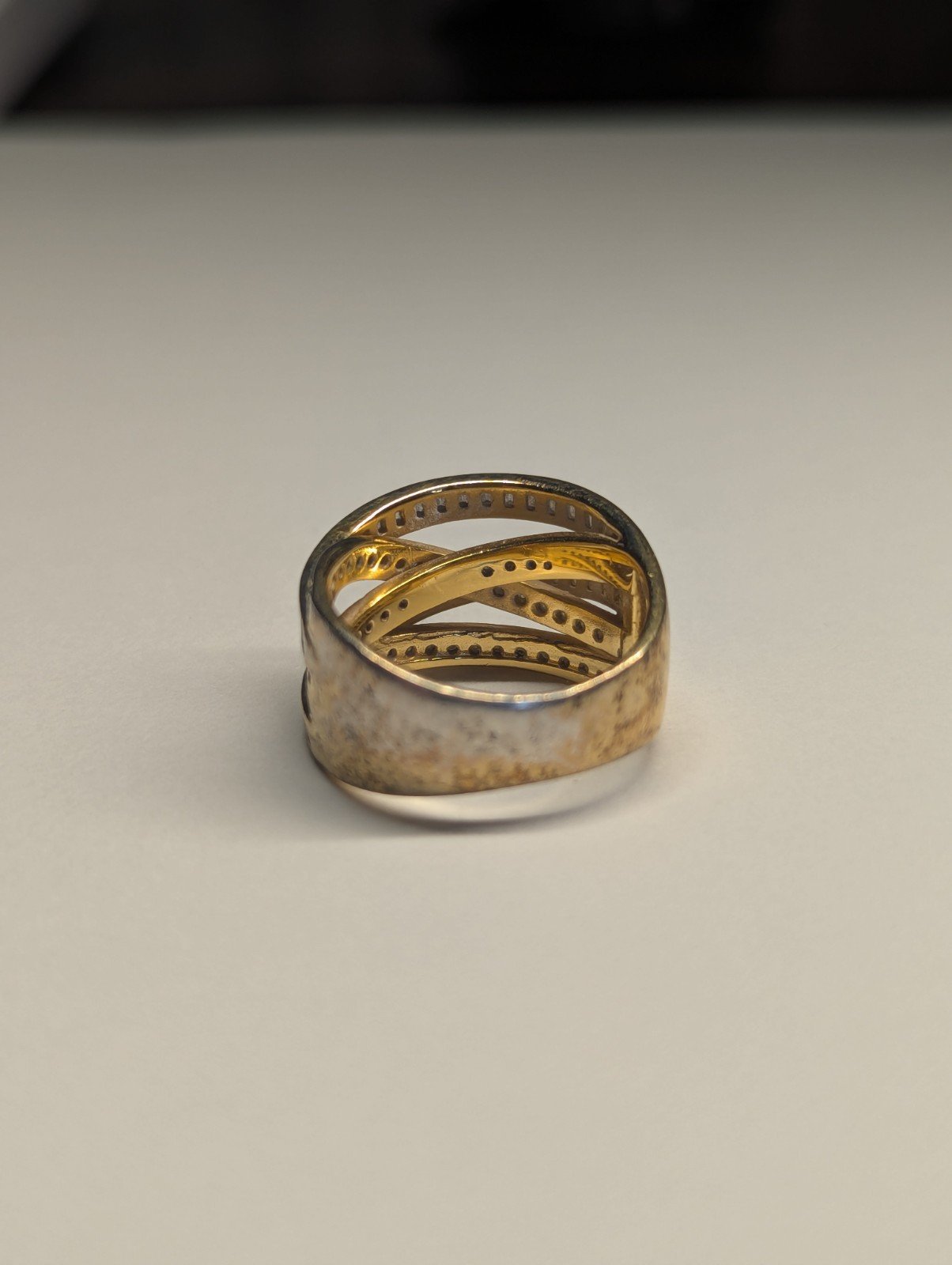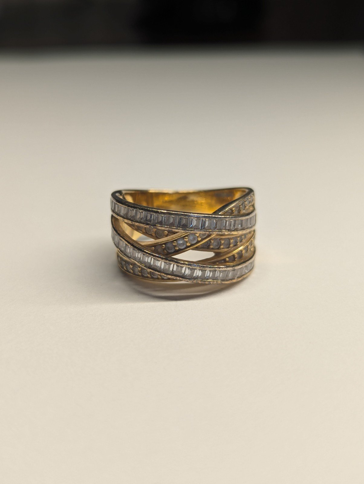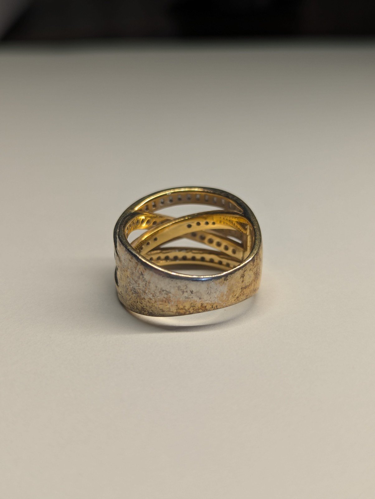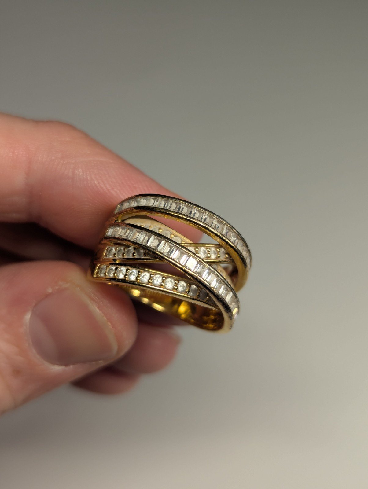 This Vintage Sterling Silver Gold Tone DQCZ Ring is a stunning piece of jewellery with a timeless elegance. The ring features beautiful clear main stones set in a gold colour, creating a luxurious contrast.