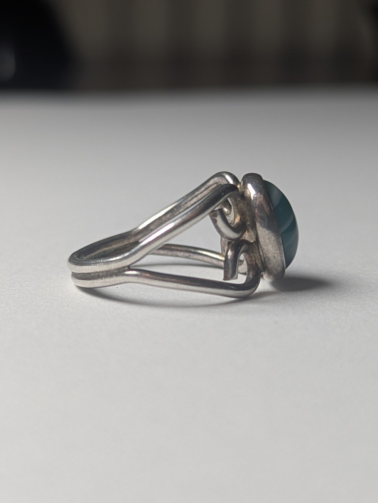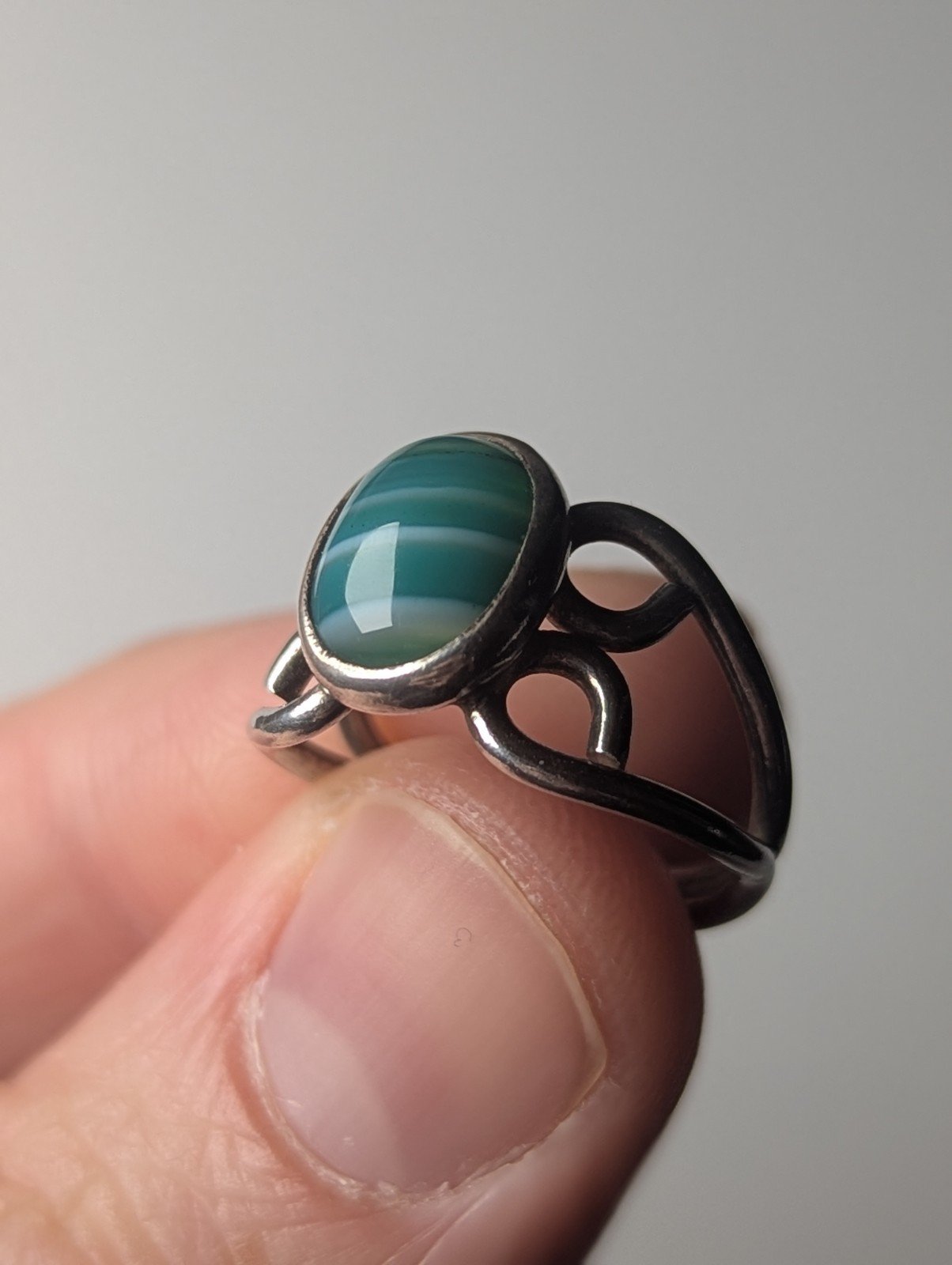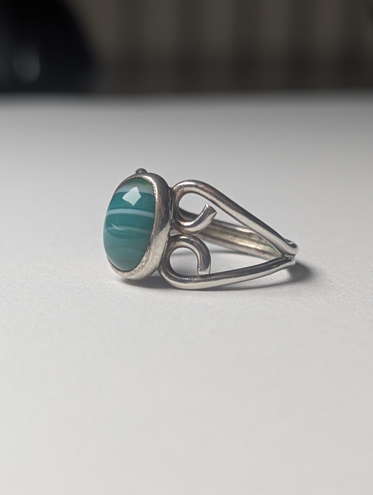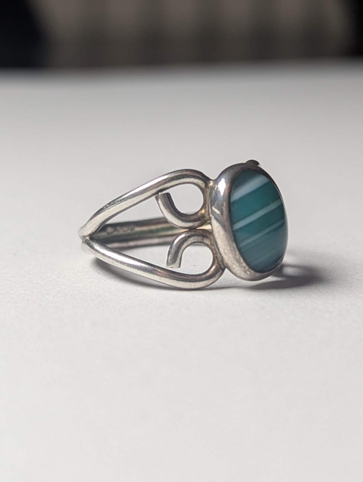 This vintage sterling silver ring features a beautiful green banded agate stone as the main gem.