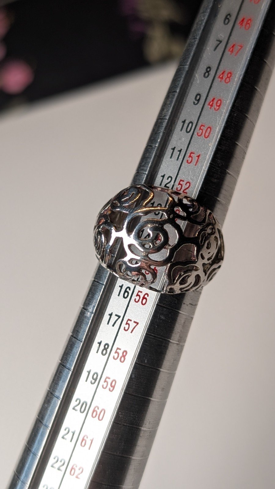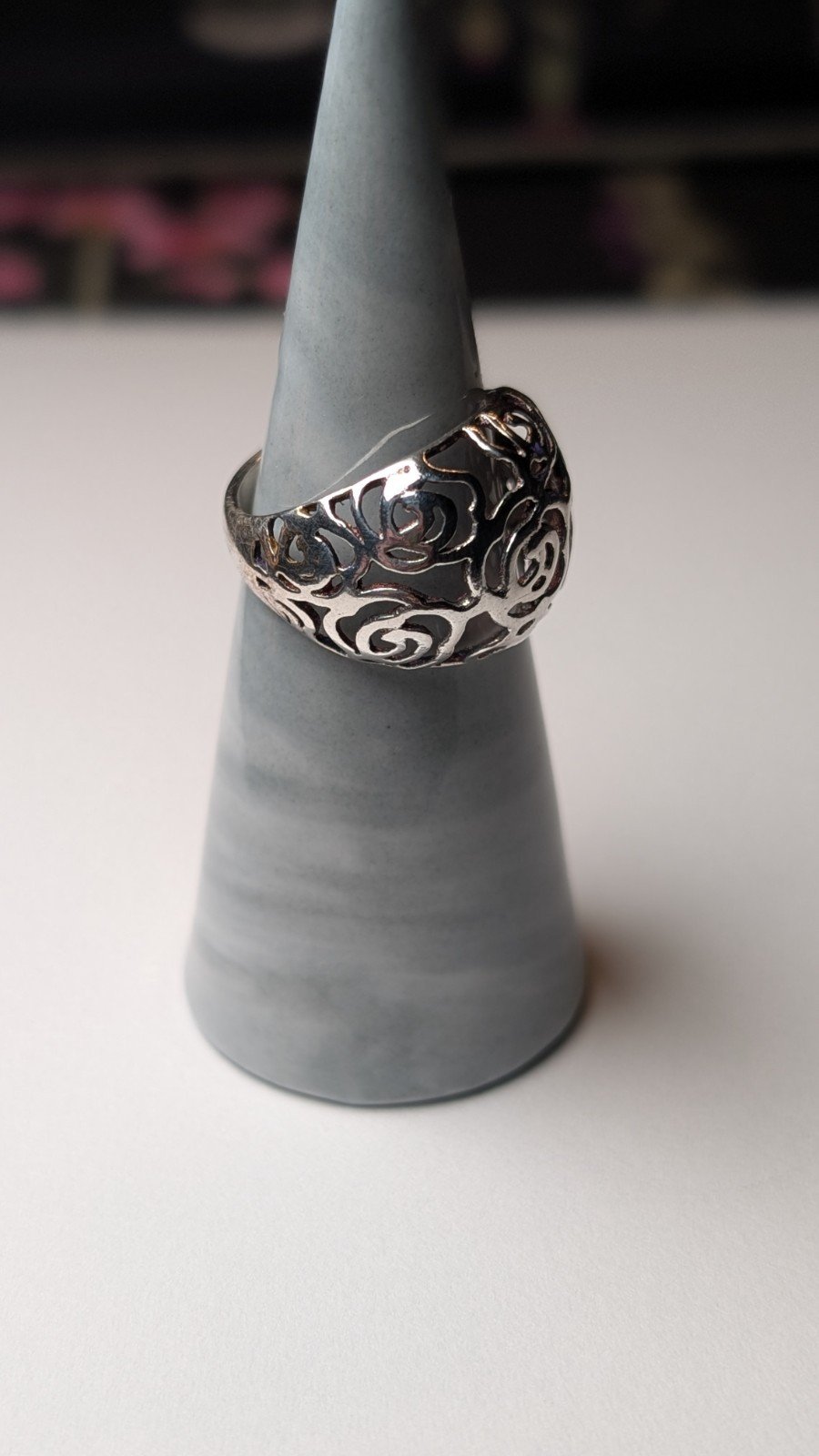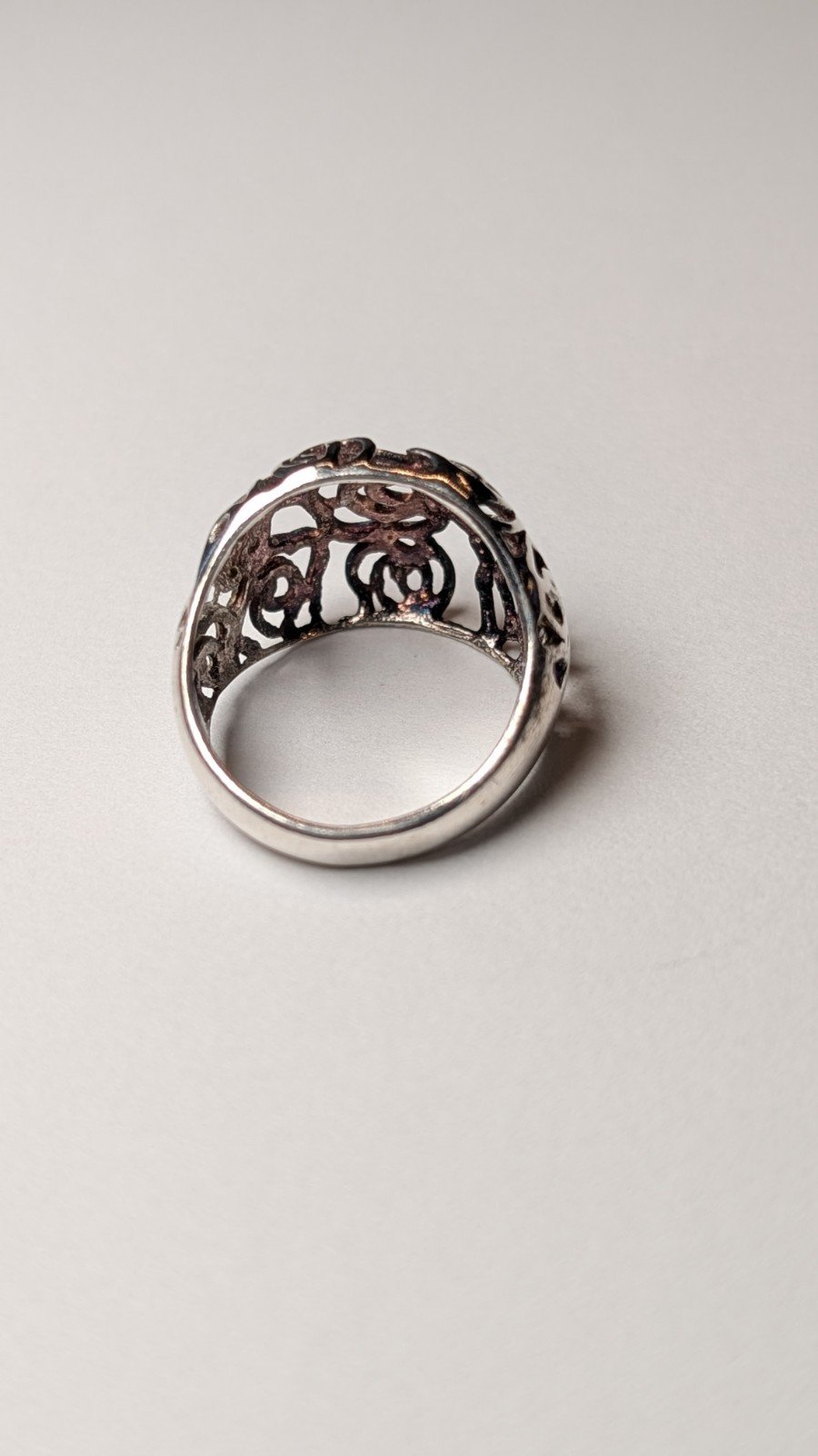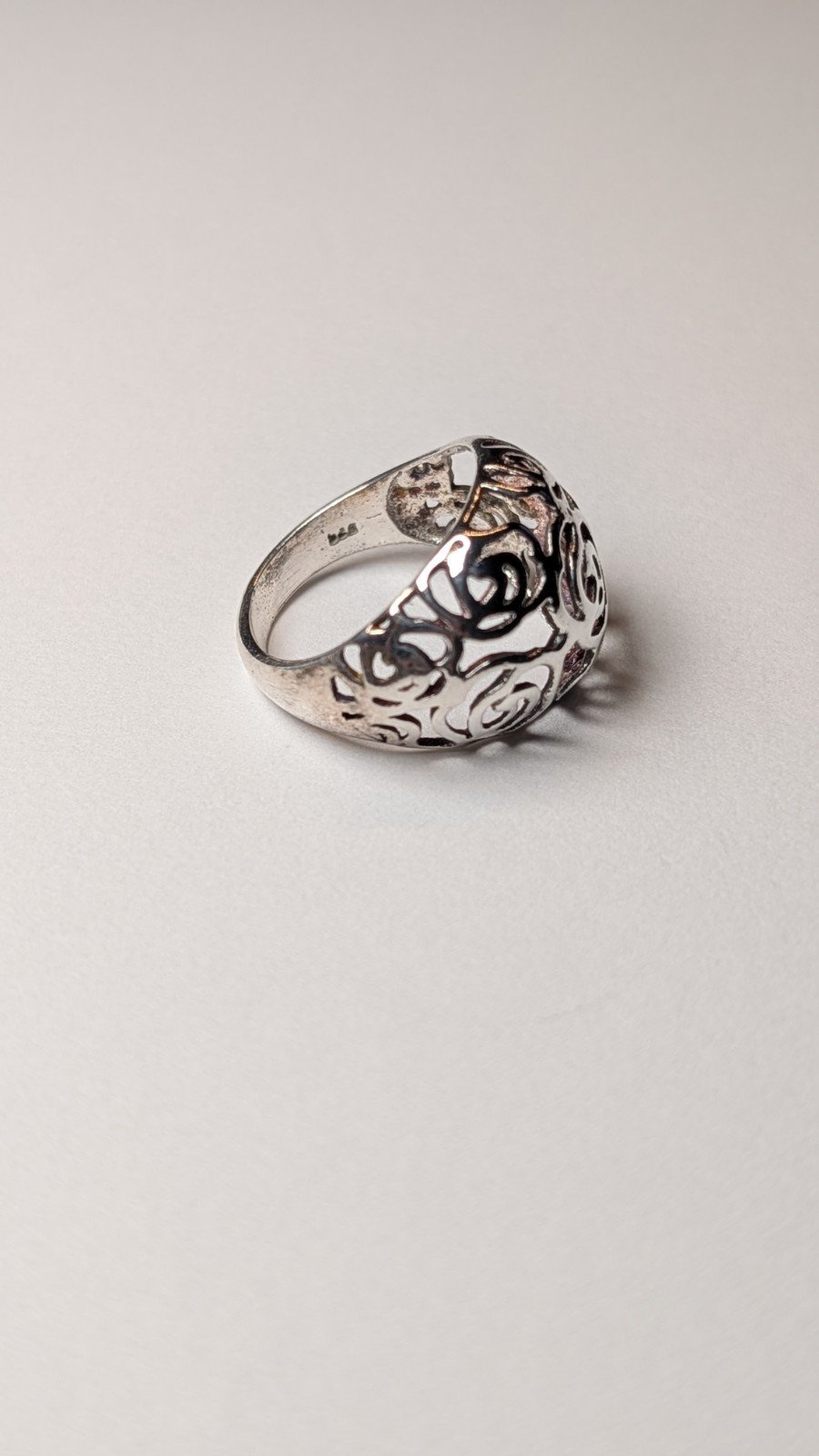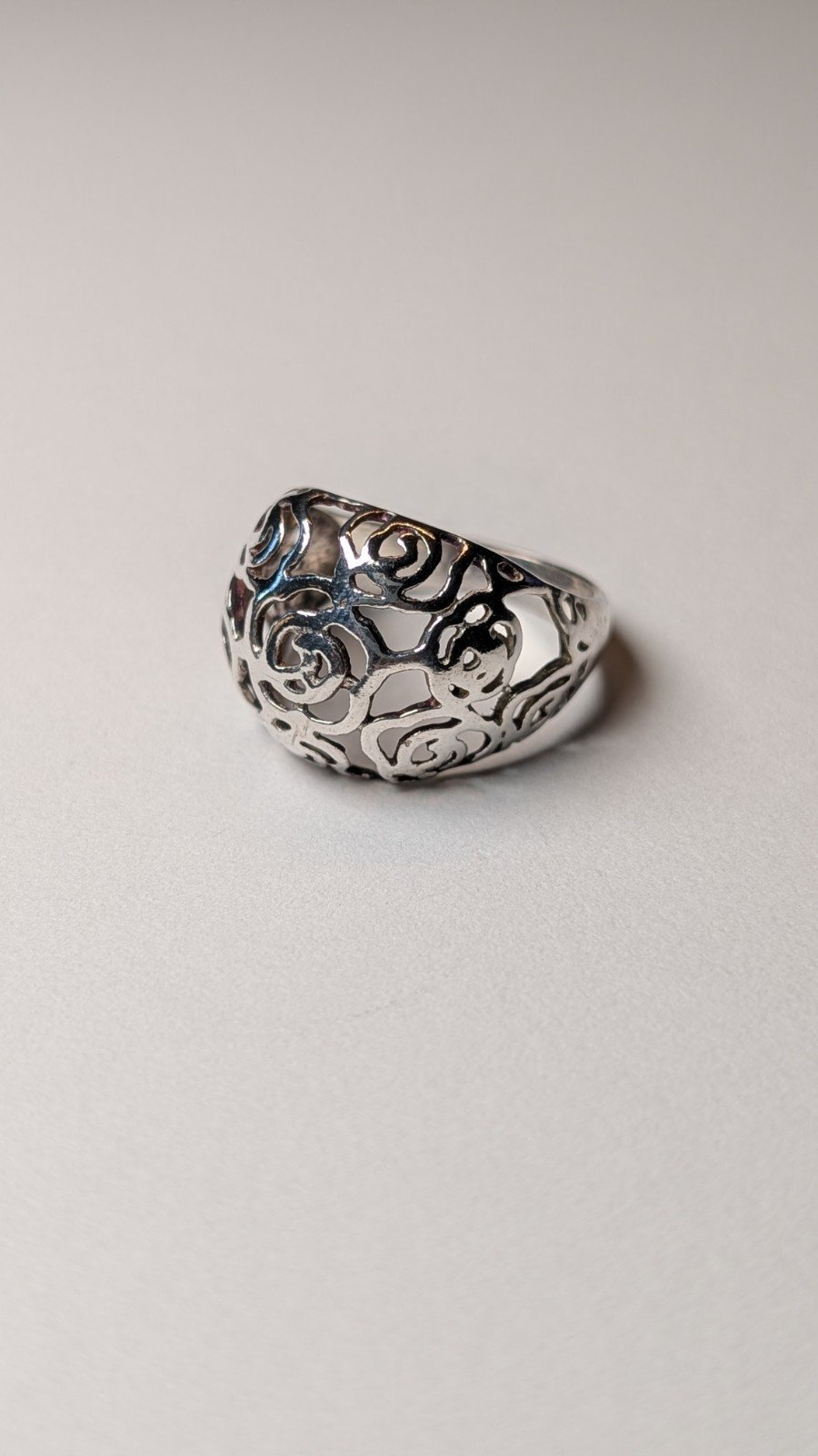 The ring features intricate openwork detailing, making it a stylish and elegant accessory for any occasion.