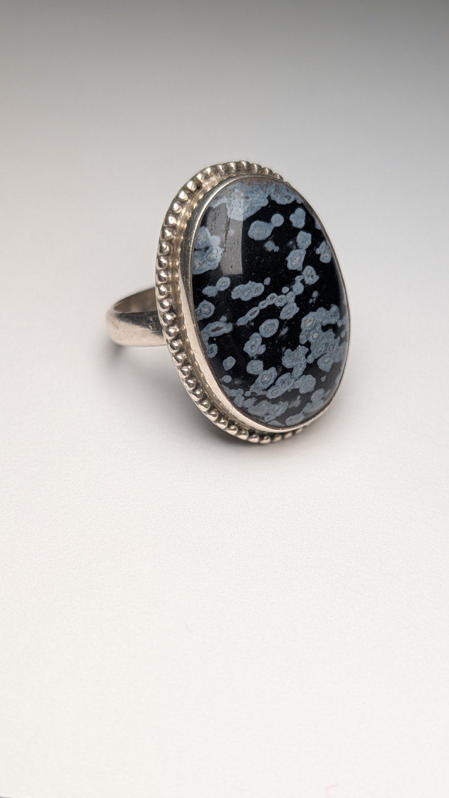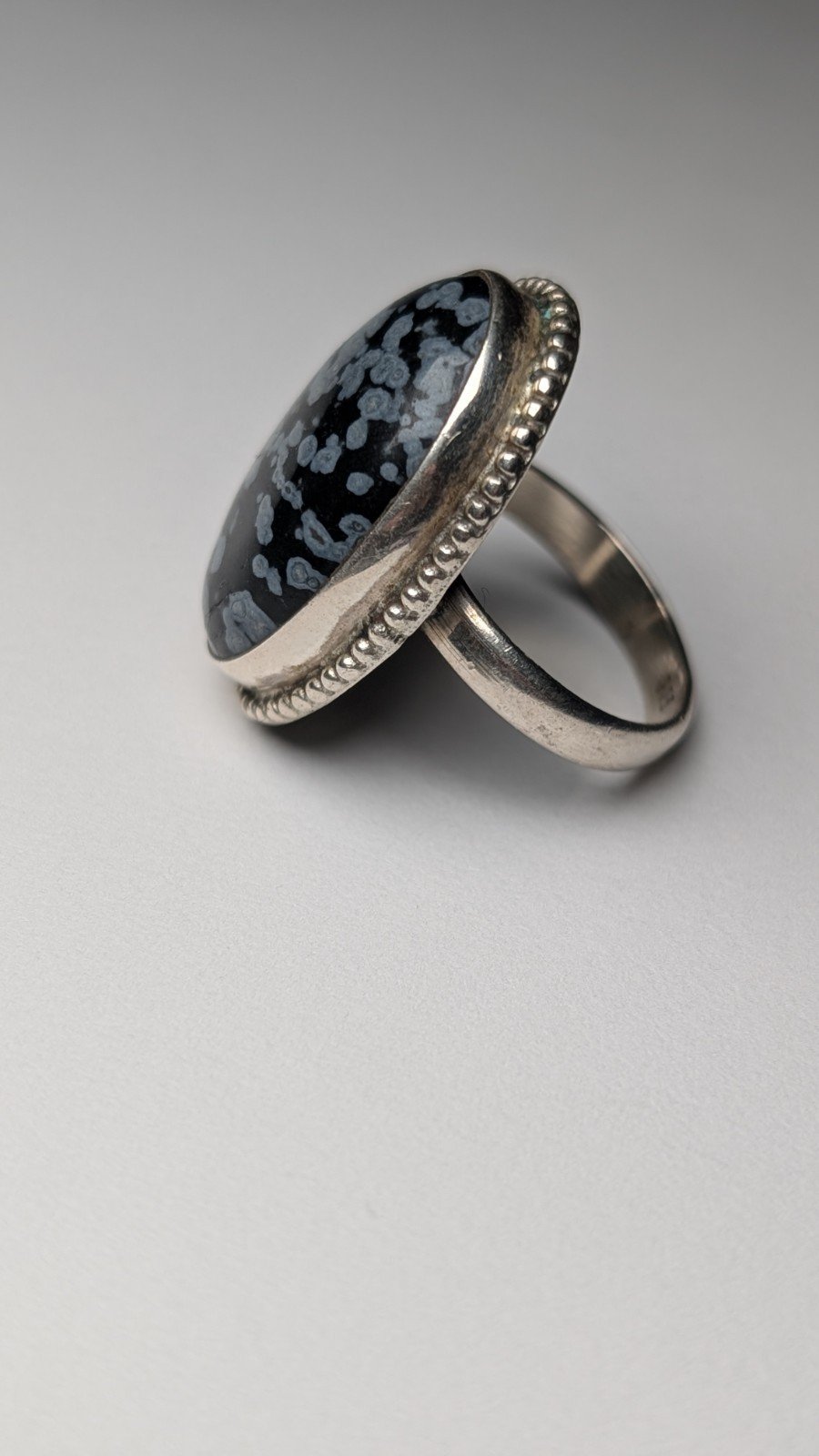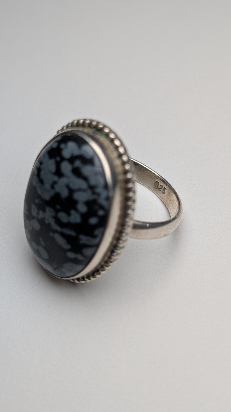 The ring features a snowflake Obsidian stone in a sterling silver setting, making it a unique and elegant piece of fine jewellery.