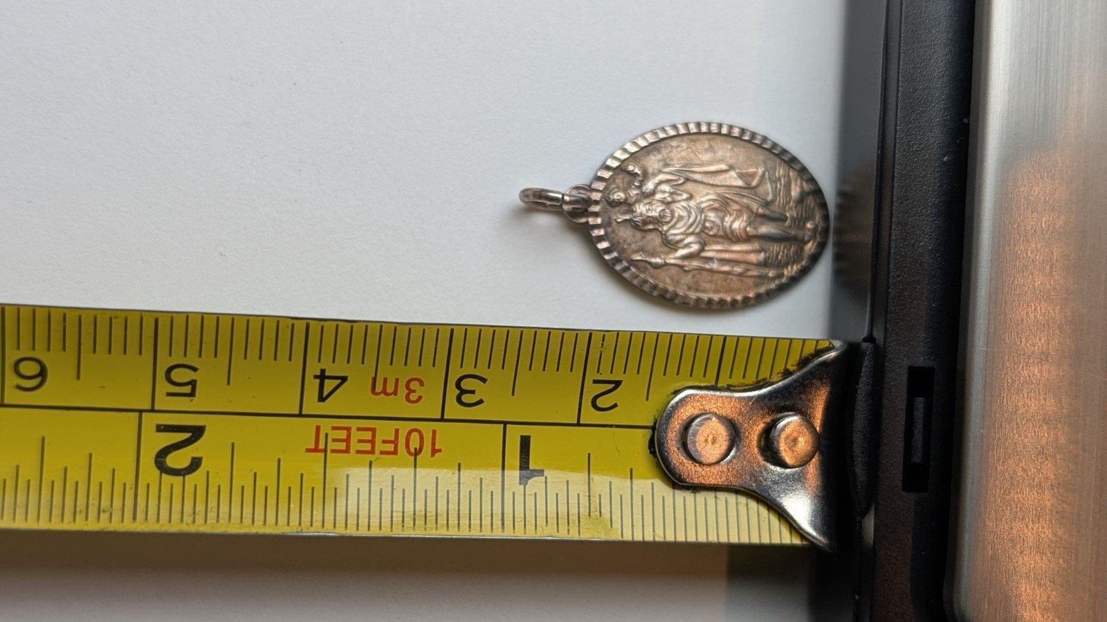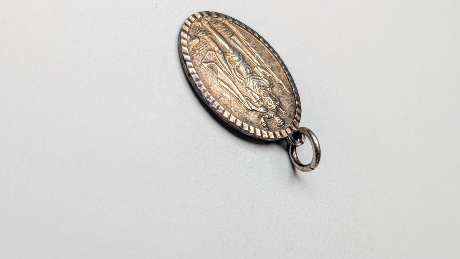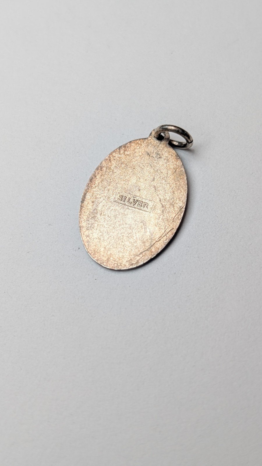 The round pendant is hallmarked, made of 925 sterling silver, and features a religious theme.