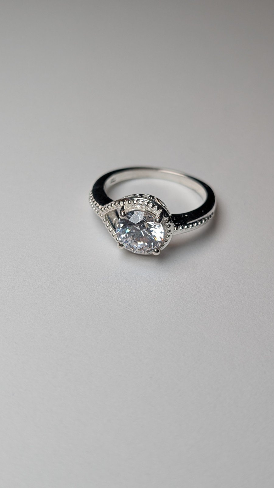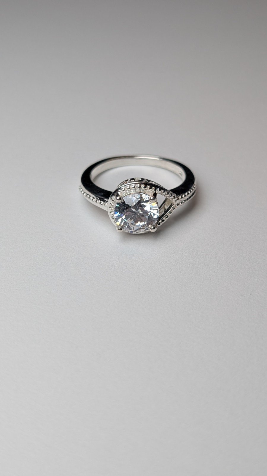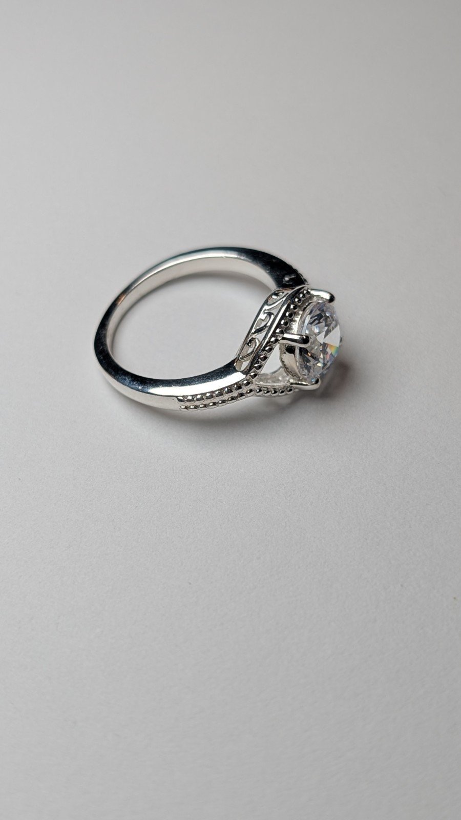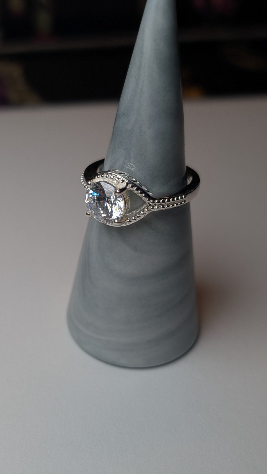 The ring features a solitaire setting style with a round clear gemstone as the main stone, set in hallmarked 925 sterling silver.