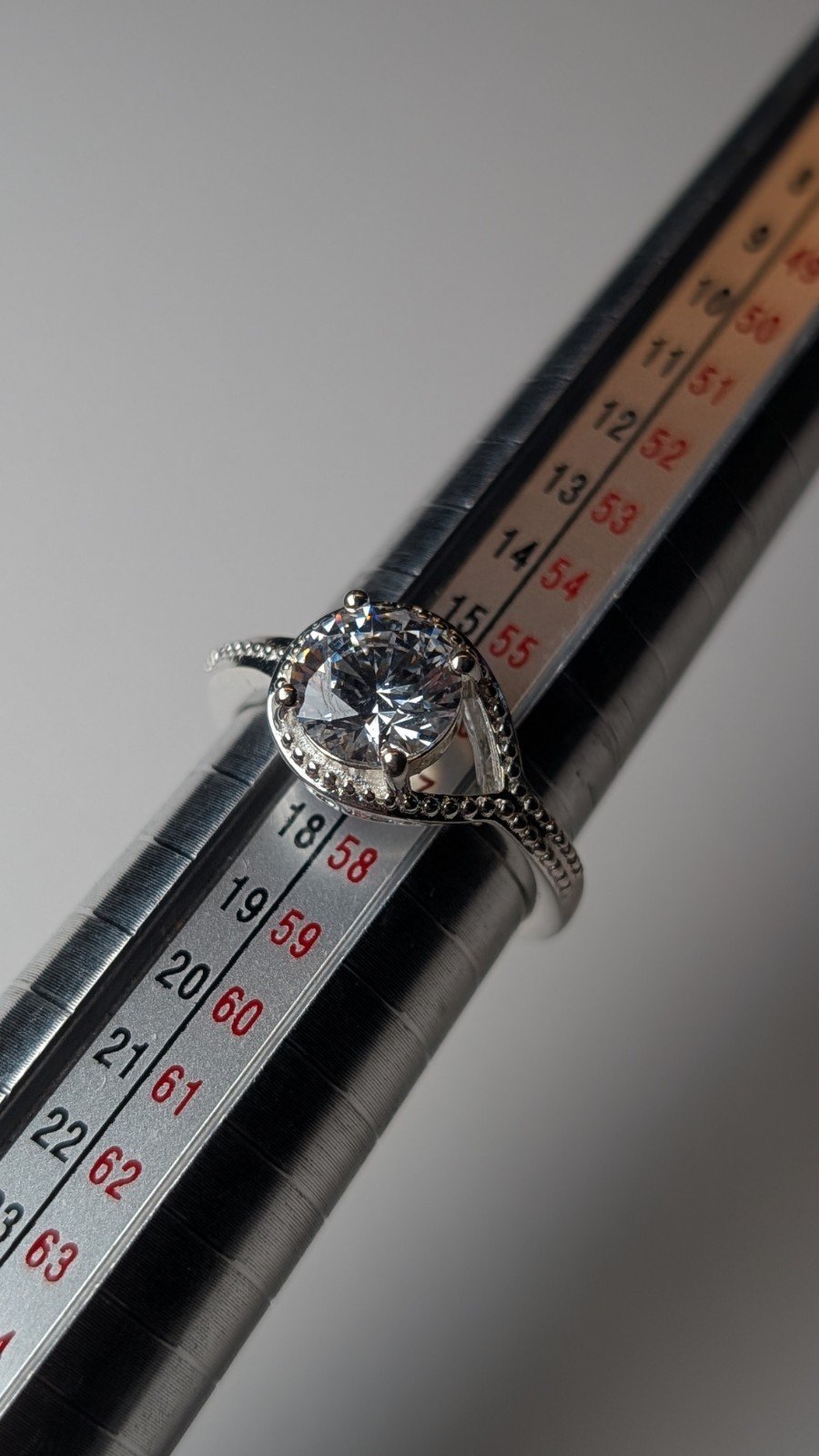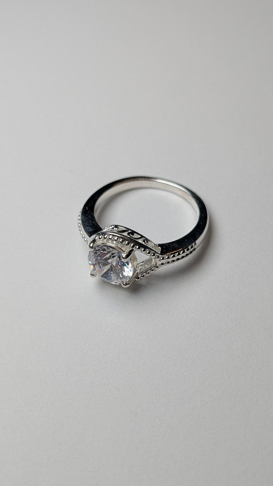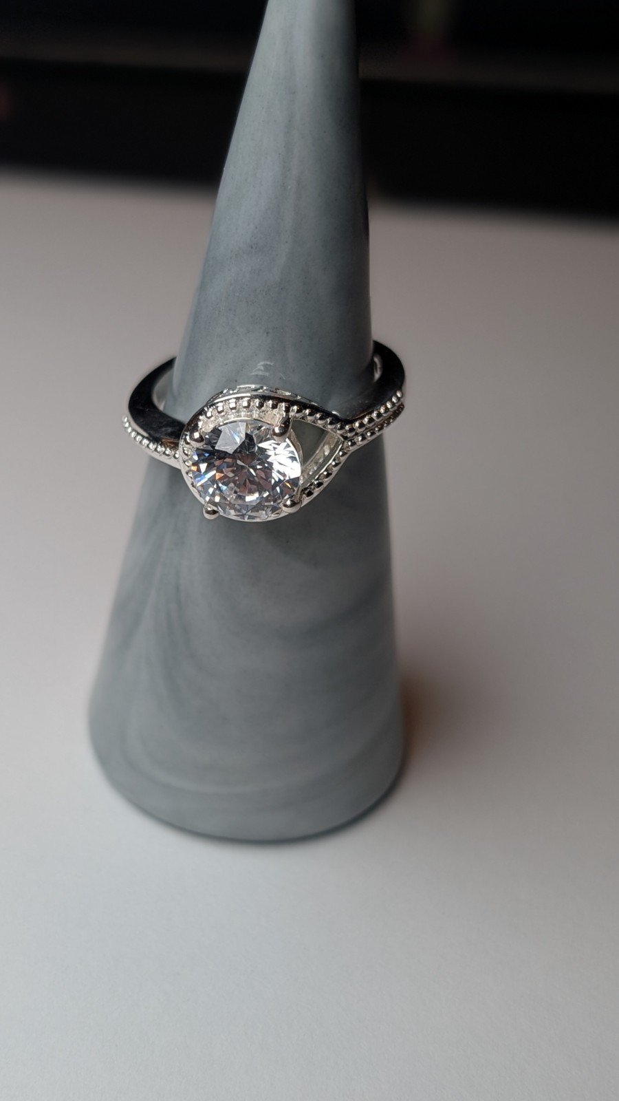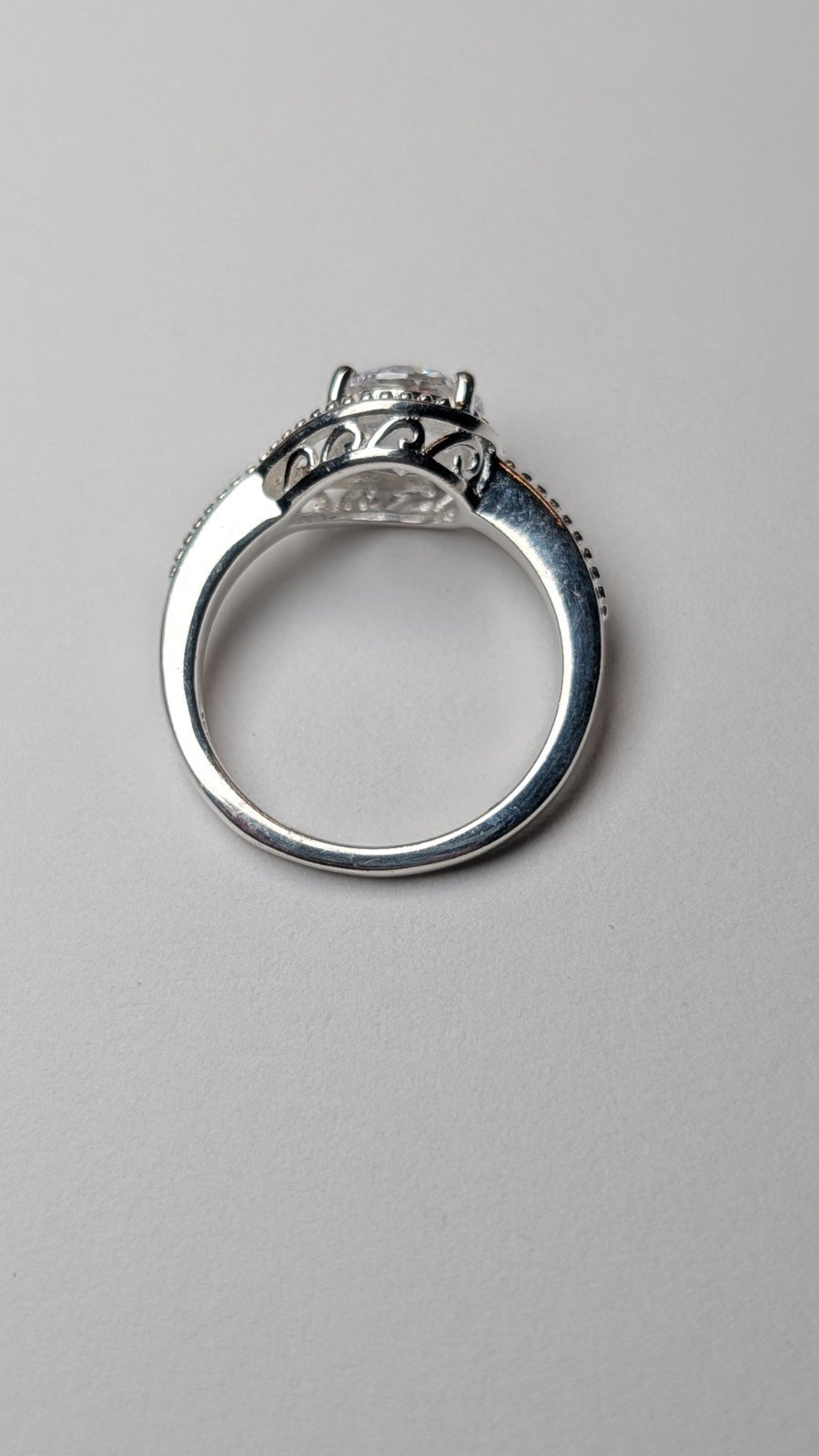 The ring features a solitaire setting style with a round clear gemstone as the main stone, set in hallmarked 925 sterling silver.