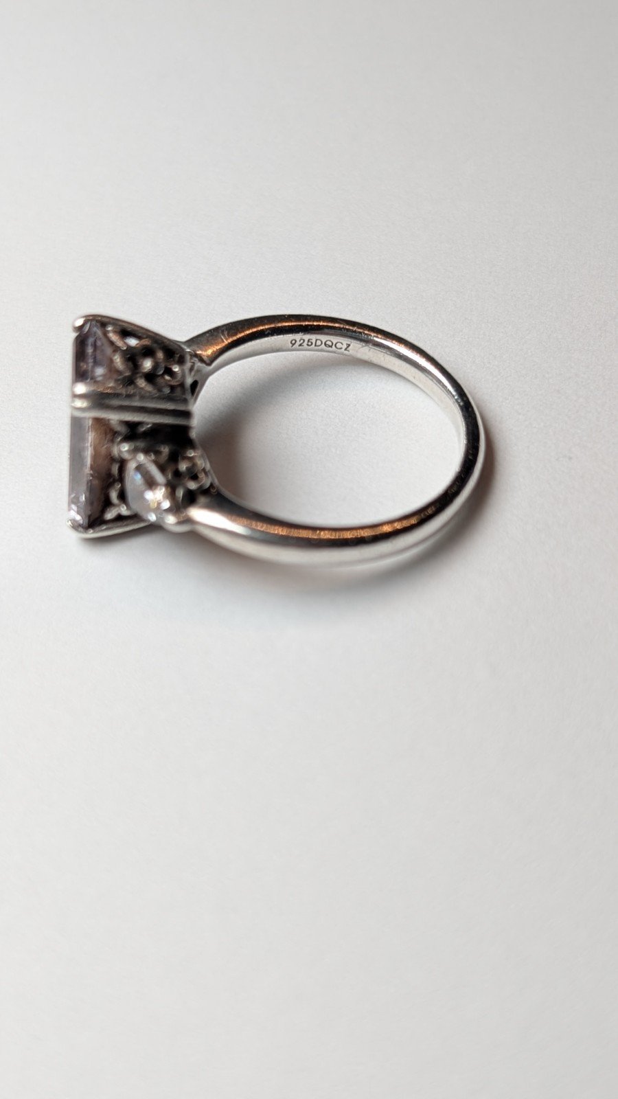 This vintage sterling silver trilogy ring features clear DQCZ gemstones set in a classic design.